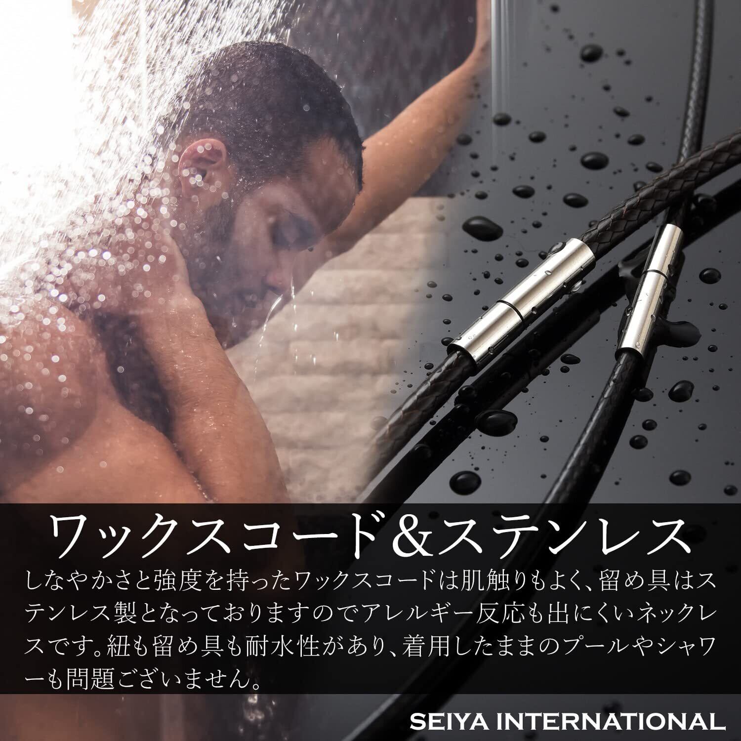 【ワックスコード】ネックレスの紐にはワックスコードを採用しています。ワックスコードとは蝋引き糸・ロウビキなどとも呼ばれるポリエステル素材にワックス加工した紐です。蝋を塗ることで耐久性が上がり、水にも強くなります。革やレザーより水や汗に強い素材で色落ちの心配もないので海やプール、お風呂やスポーツなど気にせず身に着けることができます。