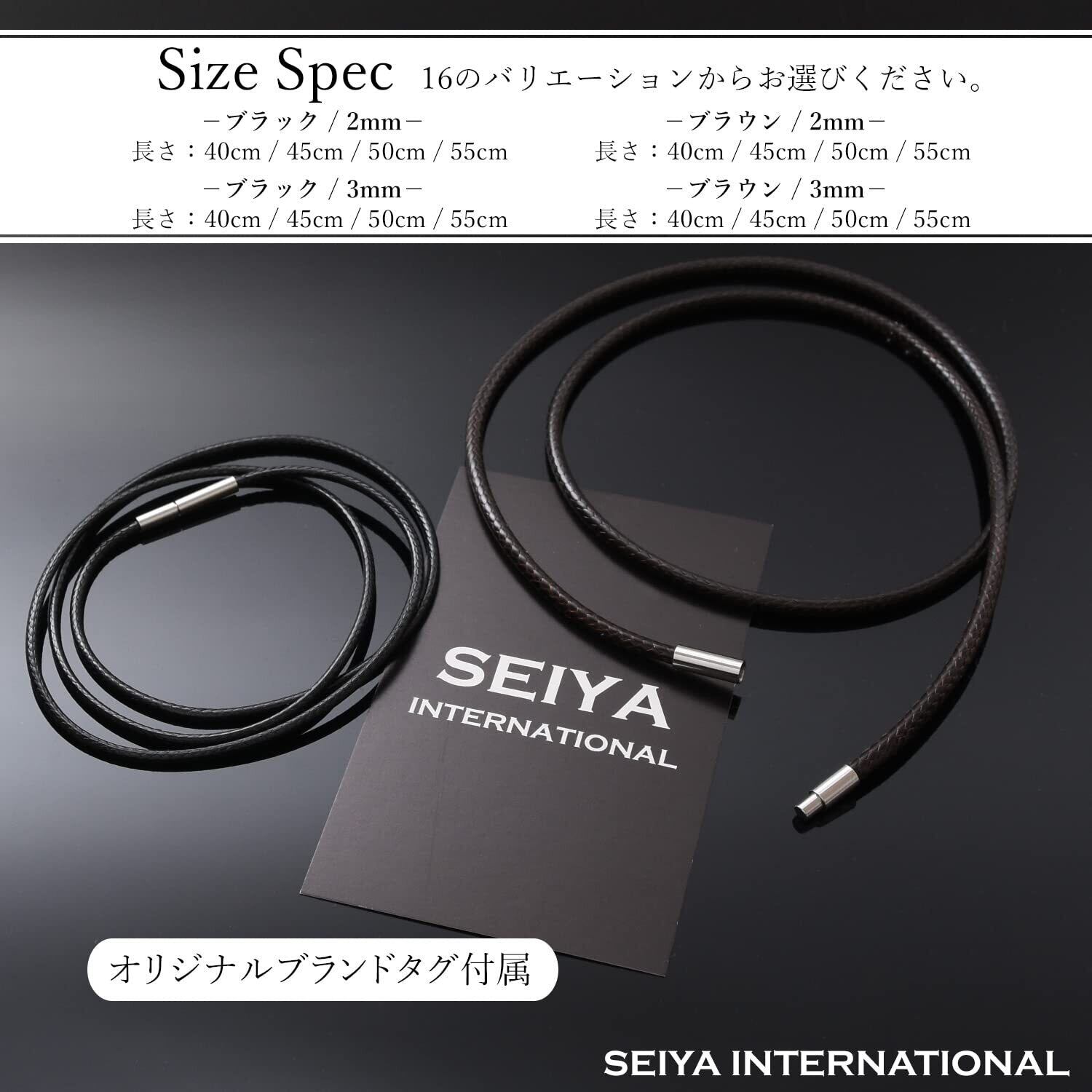 【選べるカラーサイズ】カラーは人気のブラックとブラウンをご用意しました。コードは細めの2mmと太めの3mmです。長さは40cm・45cm・50cm・55cmです。紐ネックレスはどんなファッションにも合わせやすく、太さや長さを変えるだけでも見栄えが違うのでコーディネートが楽しくなります。男性・女性問わずに使えるシンプルなデザインなのでプレゼントにも最適です。