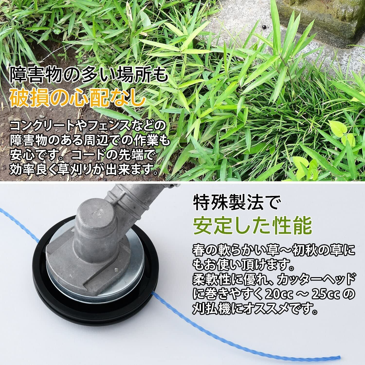 【特徴】草刈り機用静音ナイロンコードです。高品質な共重合ナイロンを使用し、丸型の耐久性と四角型の切れ味のハイブリッドで切れ味に優れます。スパイラル形状で風切り騒音を30%低減しました。コンクリートやフェンスなどの障害物に当たっても破損の心配はありません。春の柔らかい草から初秋の硬めの草にご使用いただけ、20ccから25㏄の刈払機におすすめです。