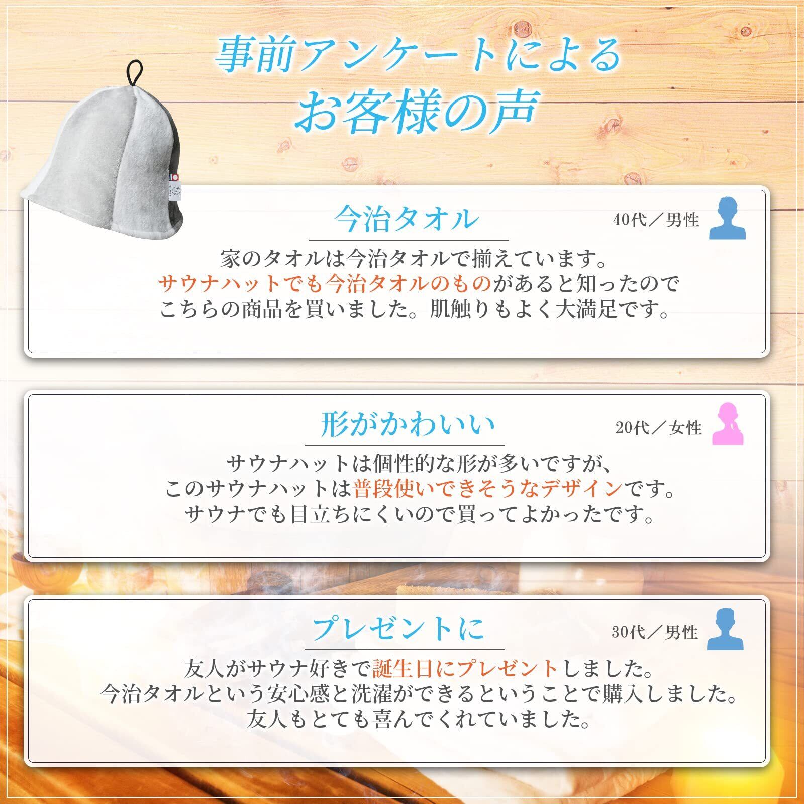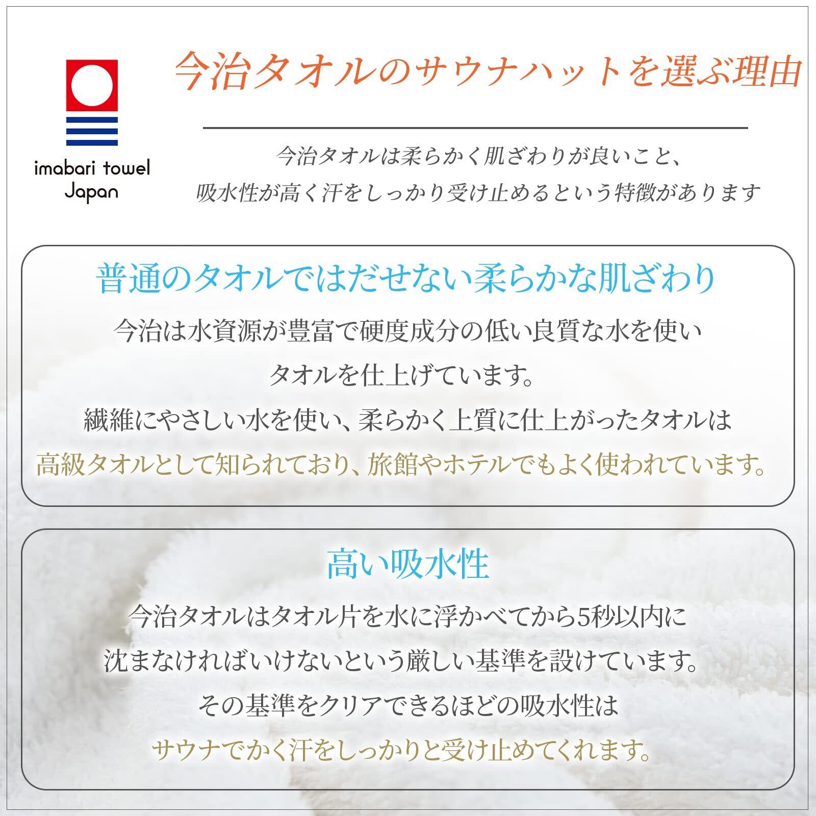 【今治タオル】高級タオルとして知られており、ホテルや旅館でもよく使われています。その柔らかな肌触りと高い吸水性は他のサウナハットでは出せない、上質な体験を演出します。