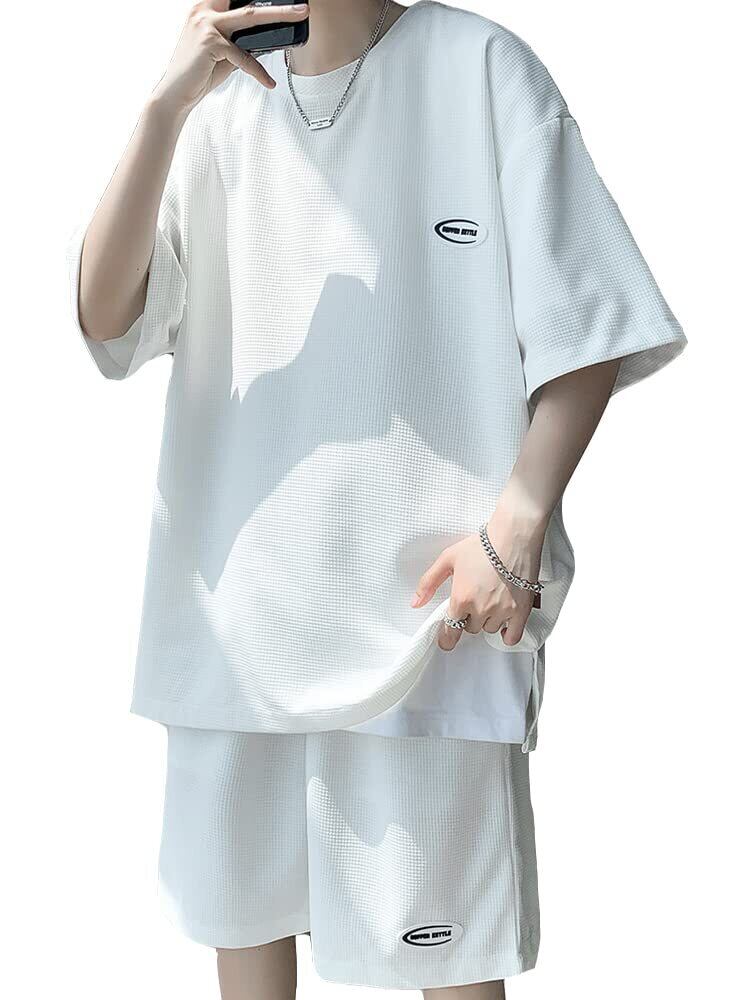 [Poperdision] 夏服 メンズ Tシャツ 半袖 上下 セット 大きいサイズ ゆったり おしゃれ ジャージ 上下 スウェット 服 トップス ハーフパンツ ショート パンツ アップ 無地 快適 スポーツウェア セットアップwhite-4XL