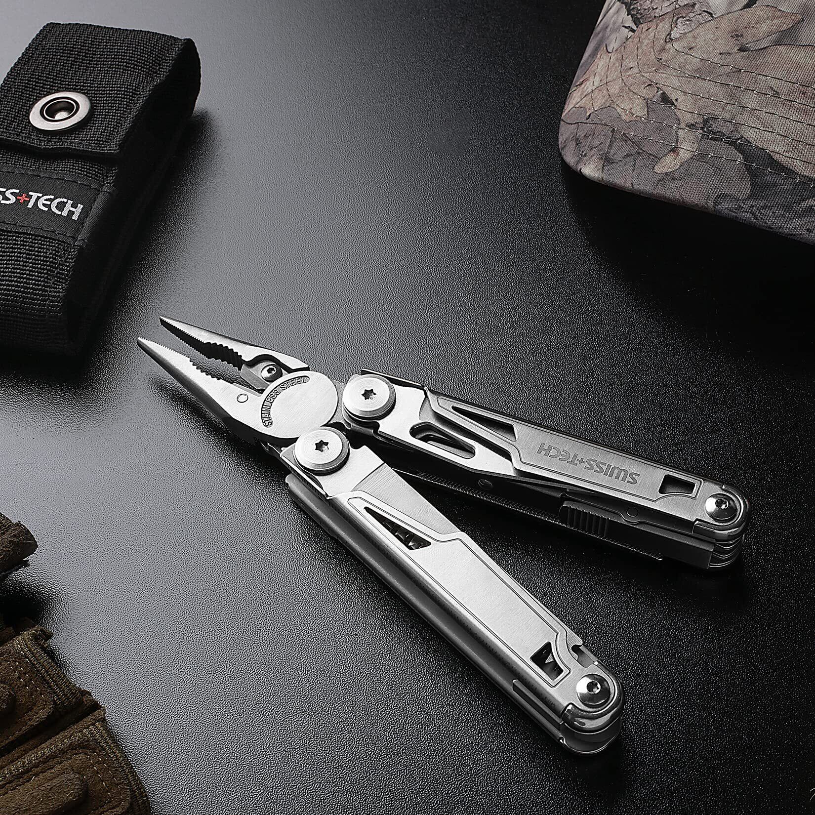Swiss+Tech 多機能ペンチ アウトドアマルチツール マルチプライヤー 16-in-1 ロック機能搭載 カッター ノコギリ ドライバー メジャー 栓抜き ヤスリ ポーチ付 アウトドア DIY 登山 キャンプ 釣り 防災用品