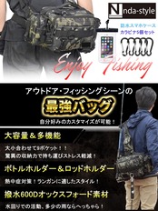 【商品説明】釣りを主に、アウトドアシーンでの使用を最大限に生かす設計のショルダーバッグです。ショルダーバッグとしてはもちろん、ハンドバッグやウエストベルトが付属しているため安定した持ち運びを可能にしたバッグです。ロッドホルダー付き(取り外し可)でフィッシングシーンでのスムーズな移動やラン&ガンの実現を可能にしたバッグです。ボトルホルダーが設計されているのでストレスなくドリンクを持ち運び事ができ熱中症対策が可能です。