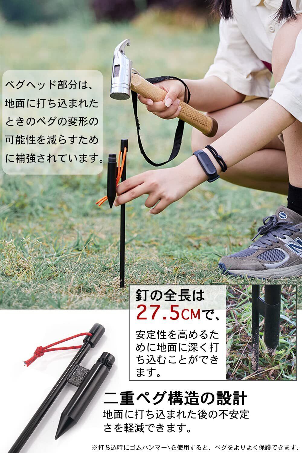 【安定性は良い、使いやすい】ペグ全長は25cmで、二重ペグ構造の設計により、地面に打ち込まれた後の不安定さを軽減できます。 ペグヘッド部分は、地面に打ち込まれたときのペグの変形の可能性を減らすために補強されています。(打ち込時にゴムハンマーを使用すると、ペグをよりよく保護できます)。市販のランタンポールとは異なり、直径1.6cmのポールを使用しています、ネジ式の連結でしっかりとした造り、安定性に優れています。