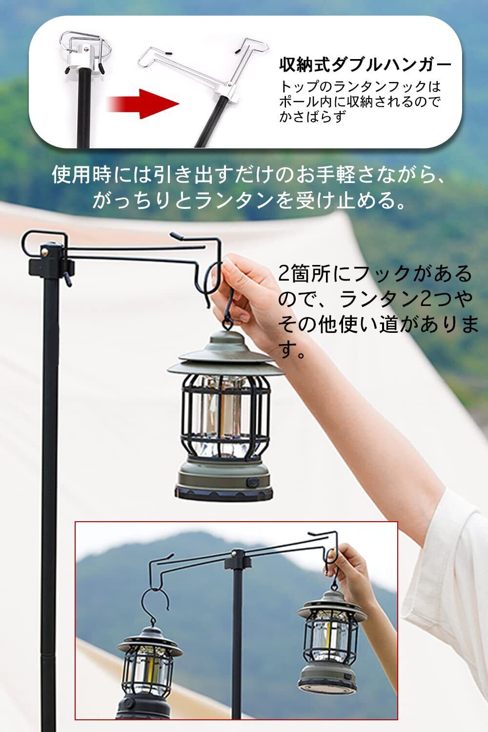 【収納式ダブルハンガー】トップのランタンフックはポール内に収納されるのでかさばらず、使用時には引き出すだけのお手軽さながら、がっちりとランタンを受け止める。2箇所にフックがあるので、ランタン2つやその他使い道があります。