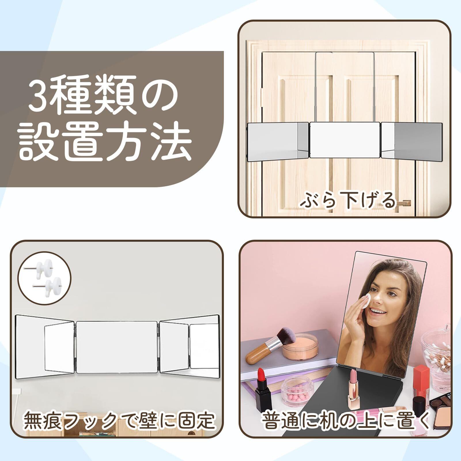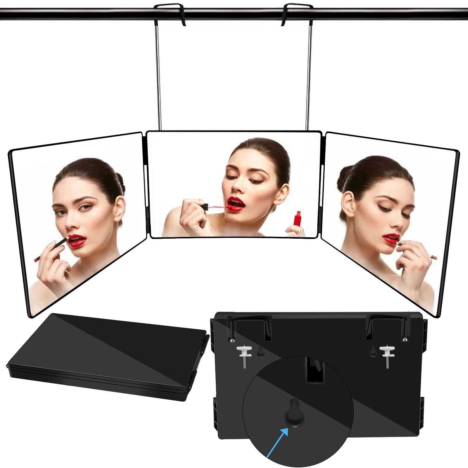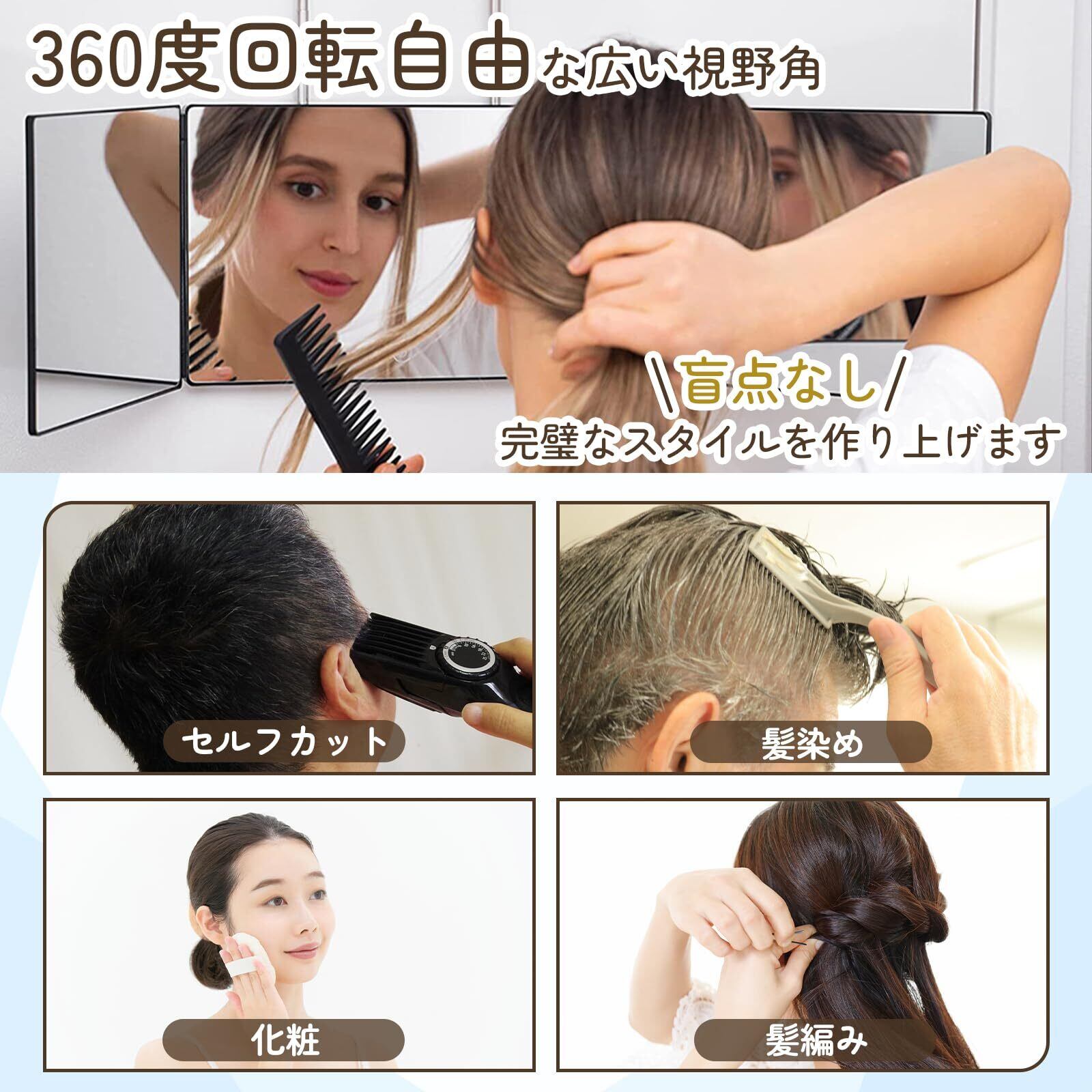 【完璧な鏡】セット内容: 三面鏡 x1、5倍の拡大鏡x1 。 360度回転設計の三面鏡、あらゆる角度から頭と顔などを快適に見ることができ、完璧なメイクを作り上げます、ヘアカット、化粧、髪染め、さげ編み、毛先切りなど、様々な用途があります。卓上での使用もでき、座り状態でメイクやヘアセットを行う場合にも使える万能型です。