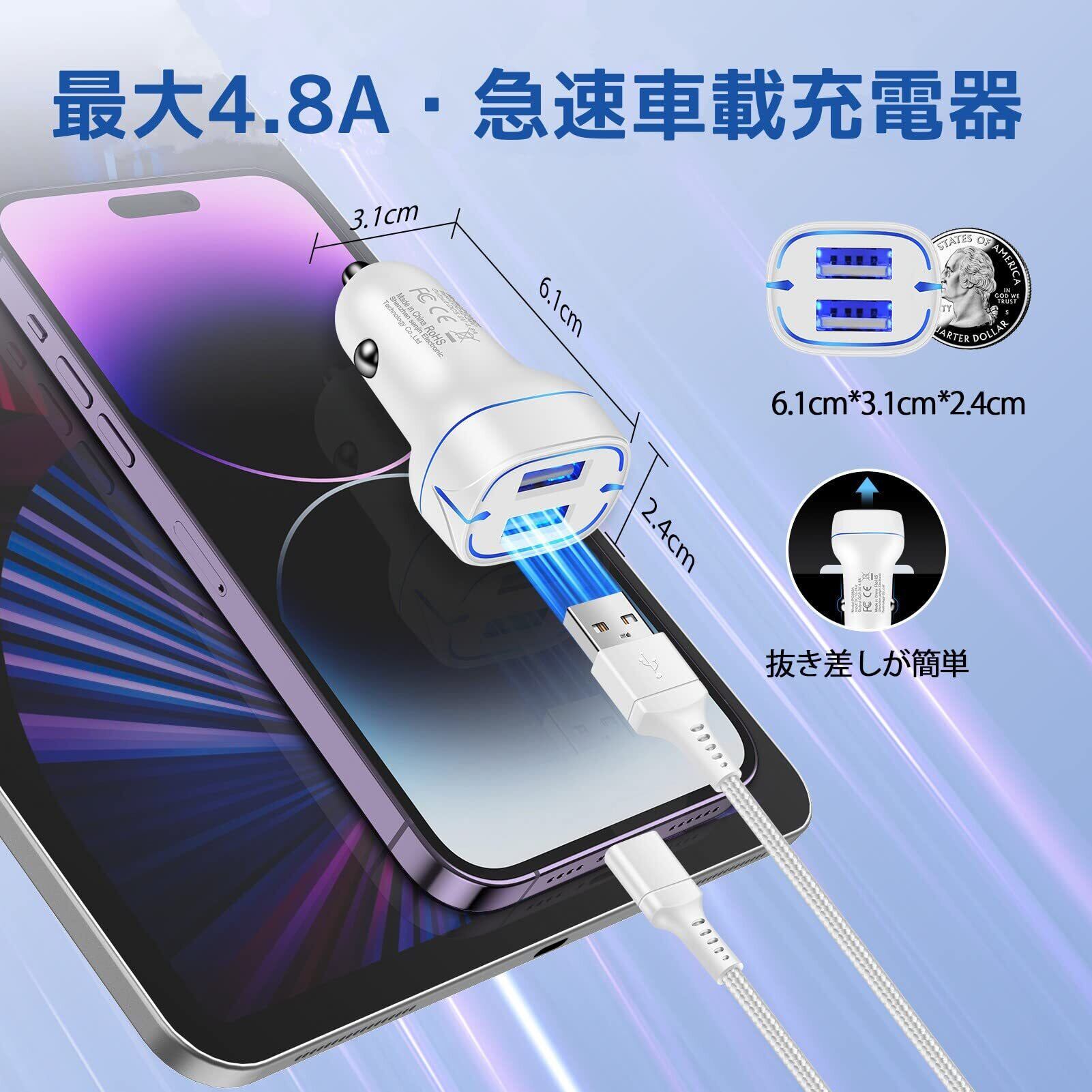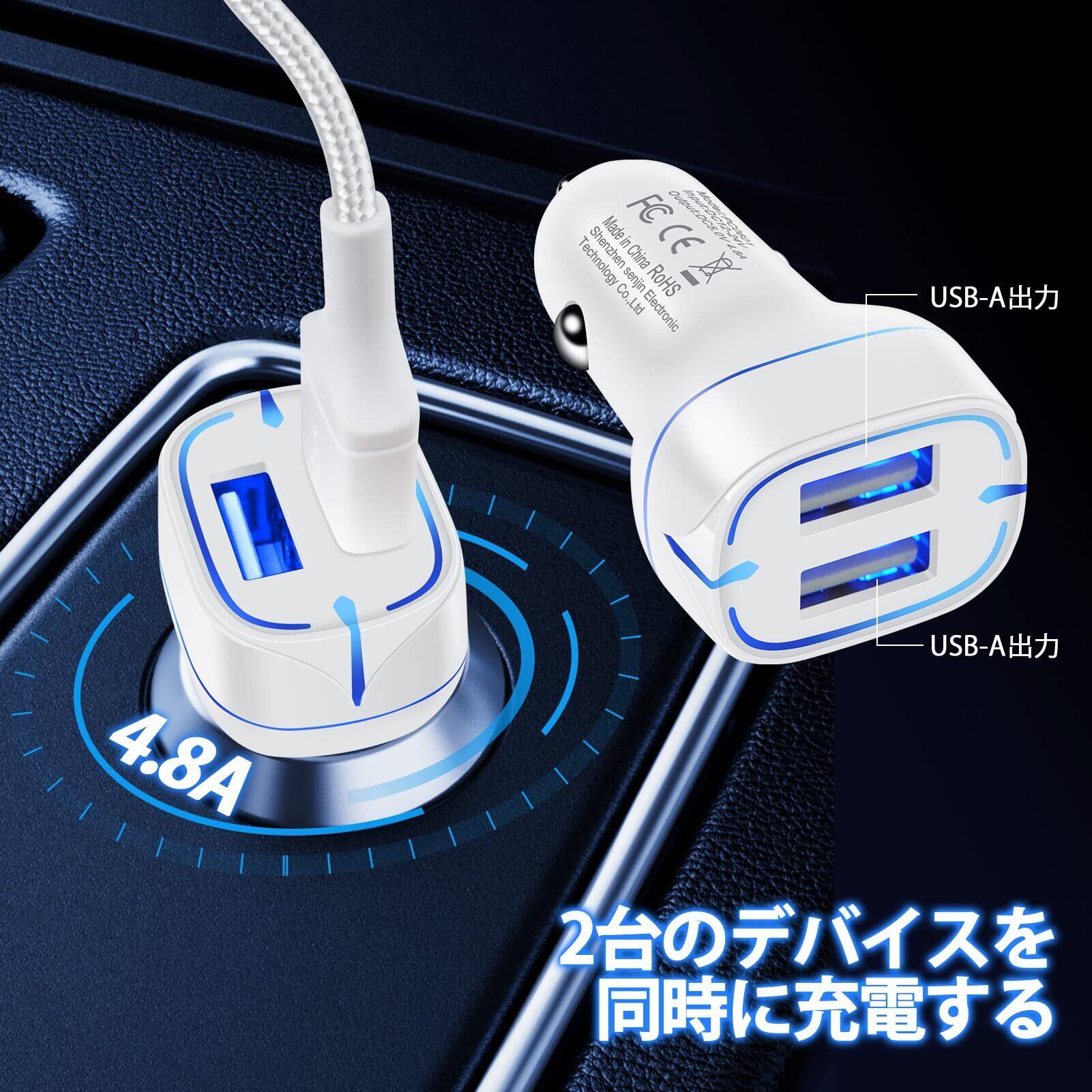 シガーソケット USB カーチャージャー 車 iPhone 充電器 USB-A 2ポート 【車載充電器 Lightningケーブル付き 1.8m】 ライトニング 超小型 軽量 車 じゅうでん器 iphone シガーソケット アイフォン USB 4.8A急速給電 GAEF しがーソケット コンパクト iPhone14/14 Pro/13/12/11/XS/X/8Android各種対応 – ホワイト