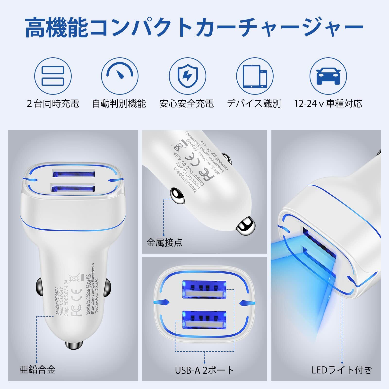 【高級なデザイン・同時充電】アップグレードのシガーソケット usb充電器は4.8AのUSB-A 2ポート搭載で、2台のデバイスを同時に高速充電できます。デュアルUSB カーチャージャーは、複数の安全認証に合格しており、傷がつきにくい亜铅合金なデザインで、車内のインテリアにも合うように仕上げました。デバイスを安全に保つために過電流および過充電などの多重保護を備えています。これはプラスチック製のものより安全です。