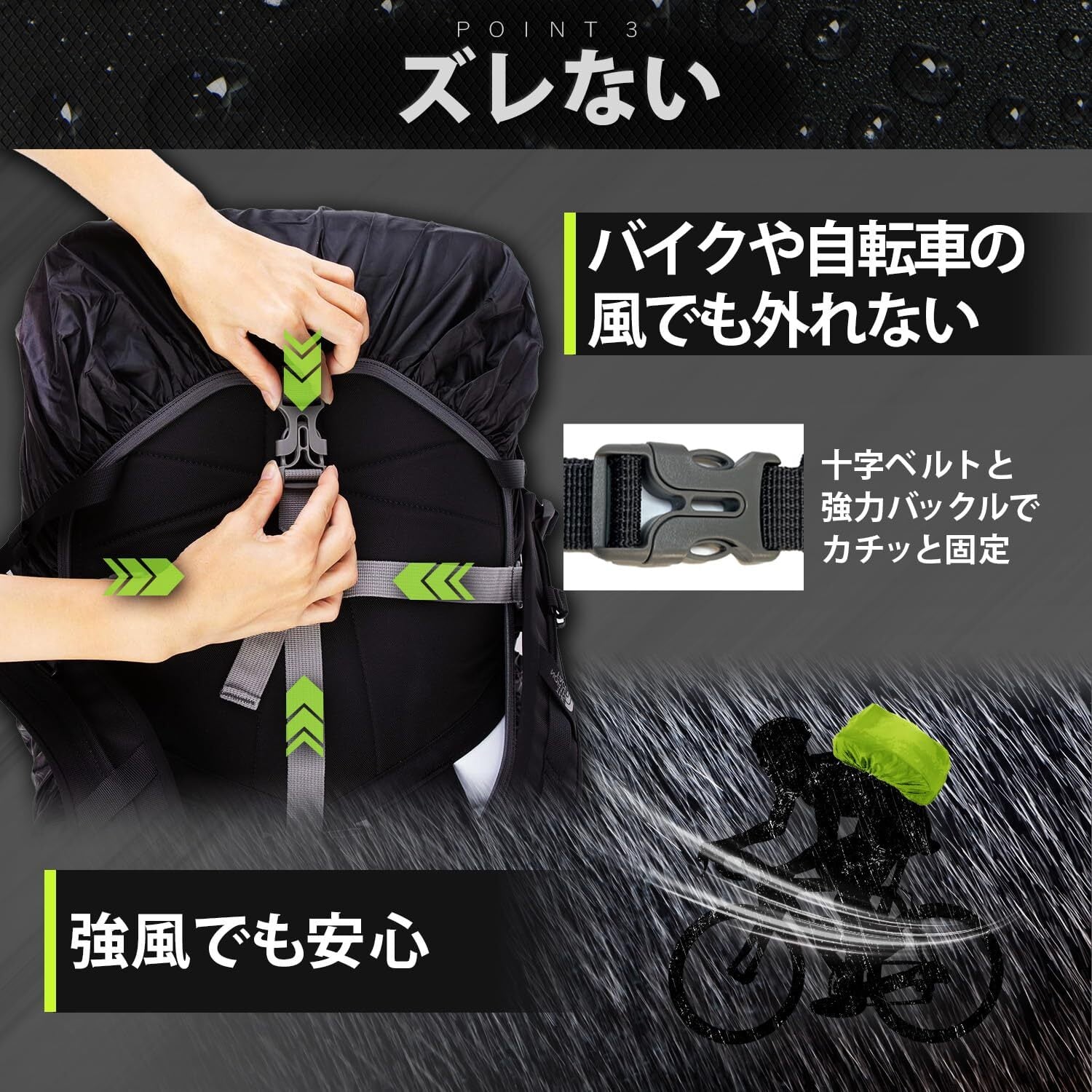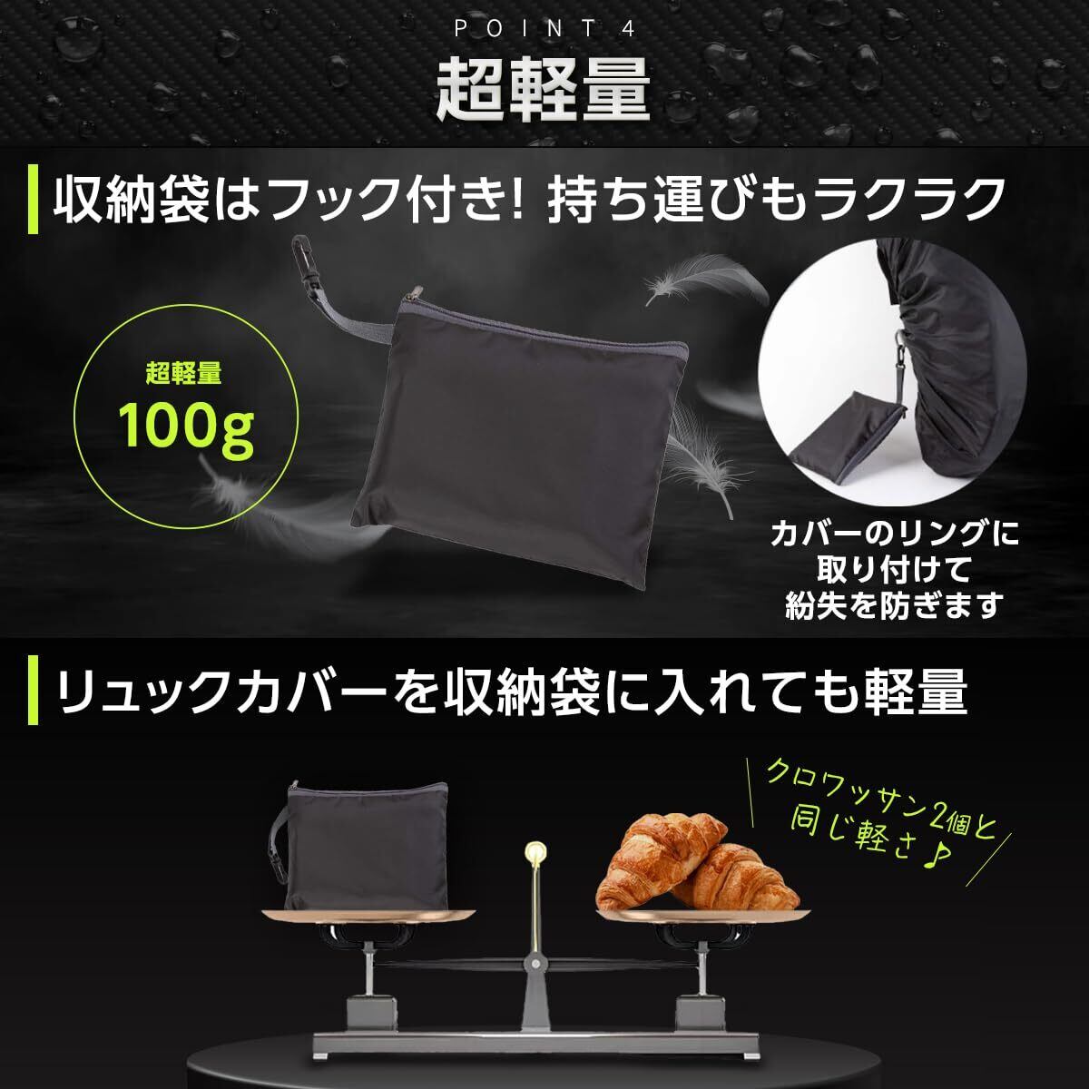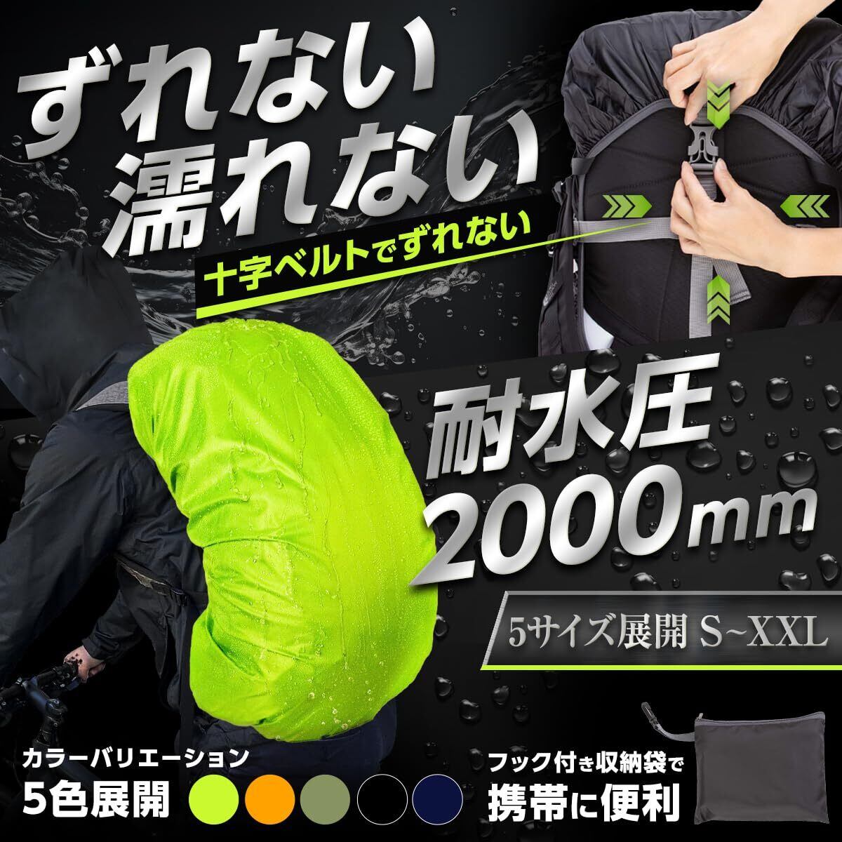 5つの魅力(1)高撥水・高耐水(2)5秒で簡単取り付け(3)十字ベルトでズレない設計(4)フック付き収納袋にコンパクト収納(5)人気のアウトドアカラー4色展開 ※リュックと背中の間にはカバーがありません。サイドからの雨の侵入が気になる方は傘との併用をおすすめいたします。