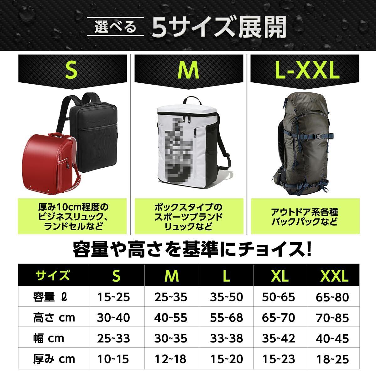 豊富な5サイズ展開 【S】15〜25L 【M】25〜35L 【L】35〜50L 【XL】50〜65L 【XXL】65〜80L ※リュックサイズの参考画像もご確認ください。スクエア型のリュックの場合は、1サイズ大きめを推奨いたします。