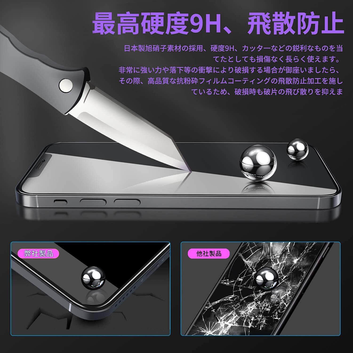 【高品質素材製、硬度9H】一般的なガラス保護フィルムよりも耐久性に優れたハードコーティング技術により、9Hの硬度を実現。特殊な飛散防止処理により、ガラスが割れても飛散せず、破片が付着したときに携帯電話の画面を傷から安全に保護できる。