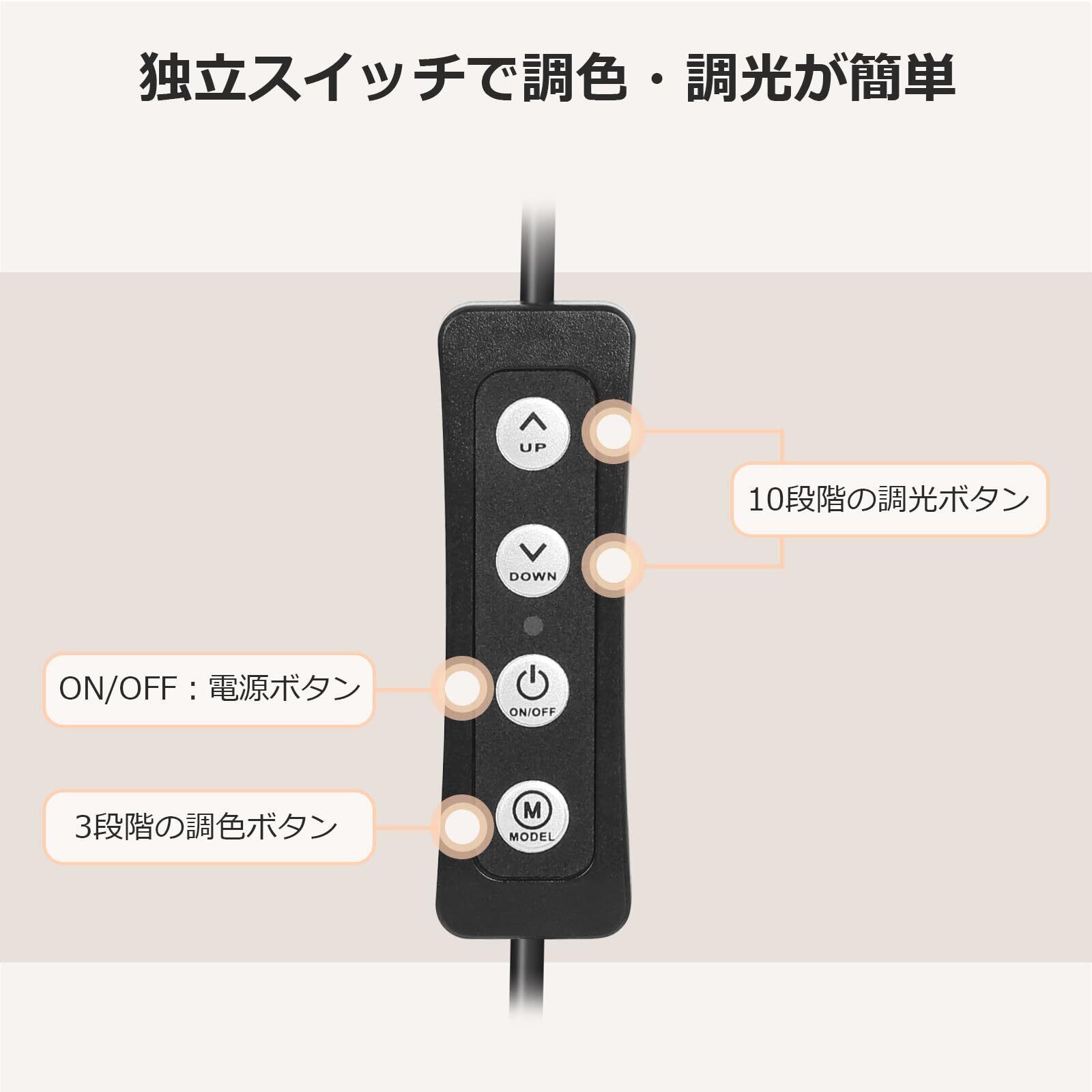 【3種の色温度・明るさ10段階】電球色、白色、昼光色の3段階調色と10段階の調光機能が搭載され、使用シーンに合わせてボタンでお好みの色と明るさが変えられます。メモリー機能により、次回使用時に最後のモードと明るさが維持されます。明るさは最大460ルーメンとなり、他の製品より明るくて、作業や勉強などに最適です!