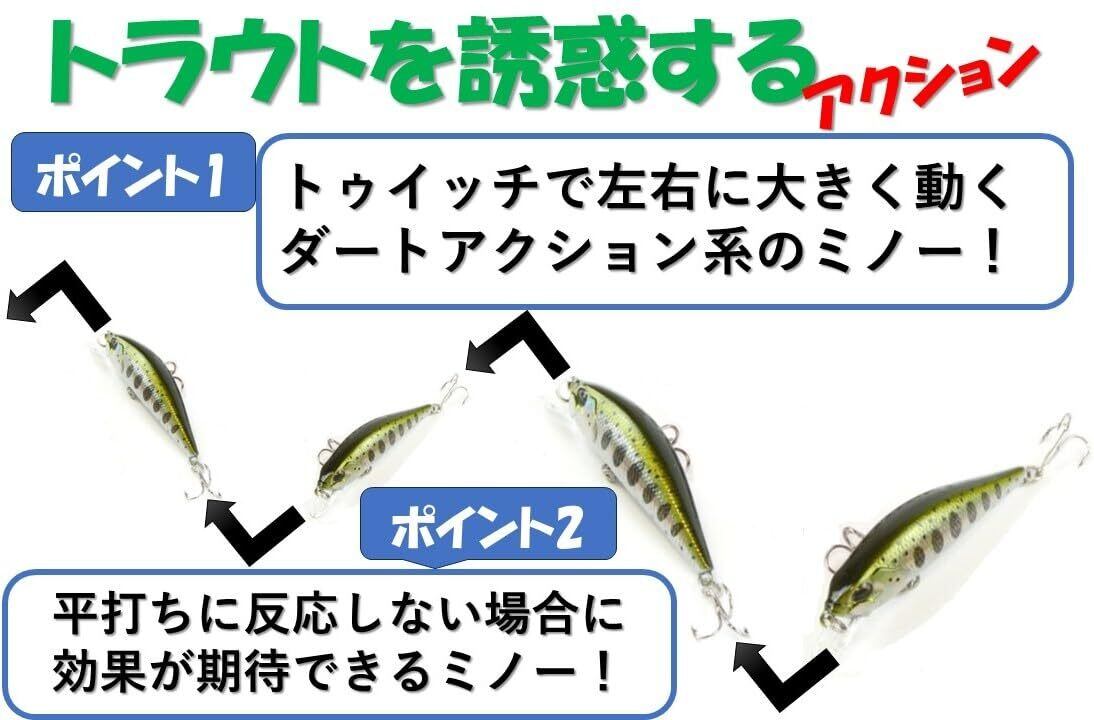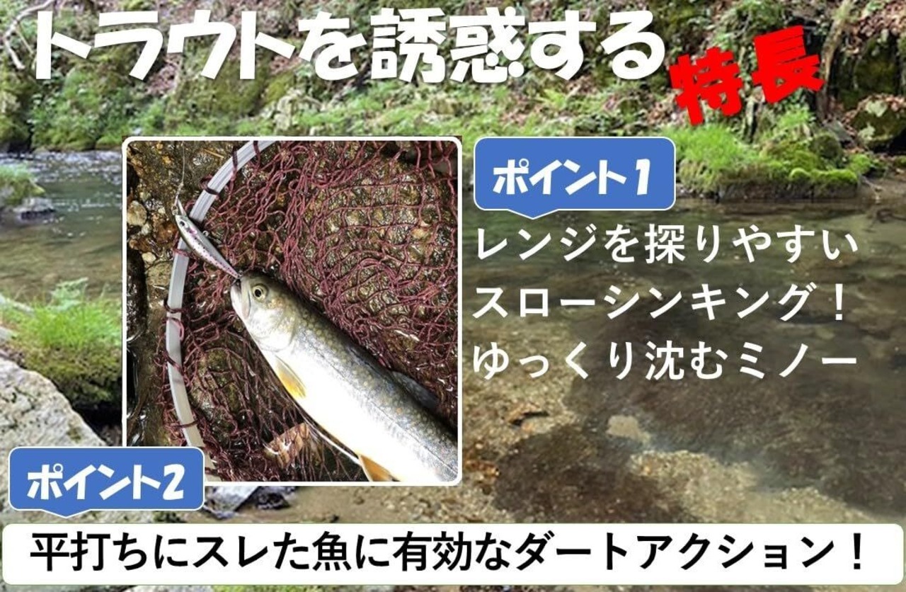 渓流から本流まで使えるシンキングミノー!トラウトだけでなくバスにも実績があるルアー!幅広いシーンで活躍し、安定的な釣果をもたらします。