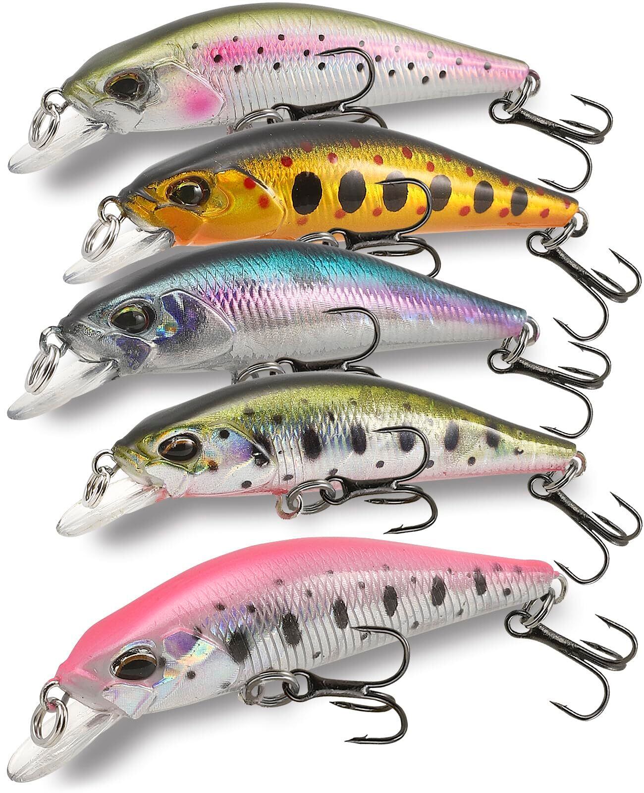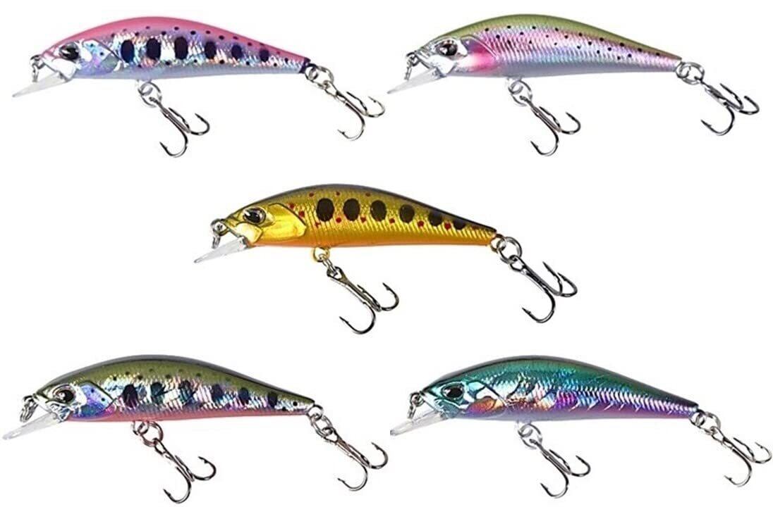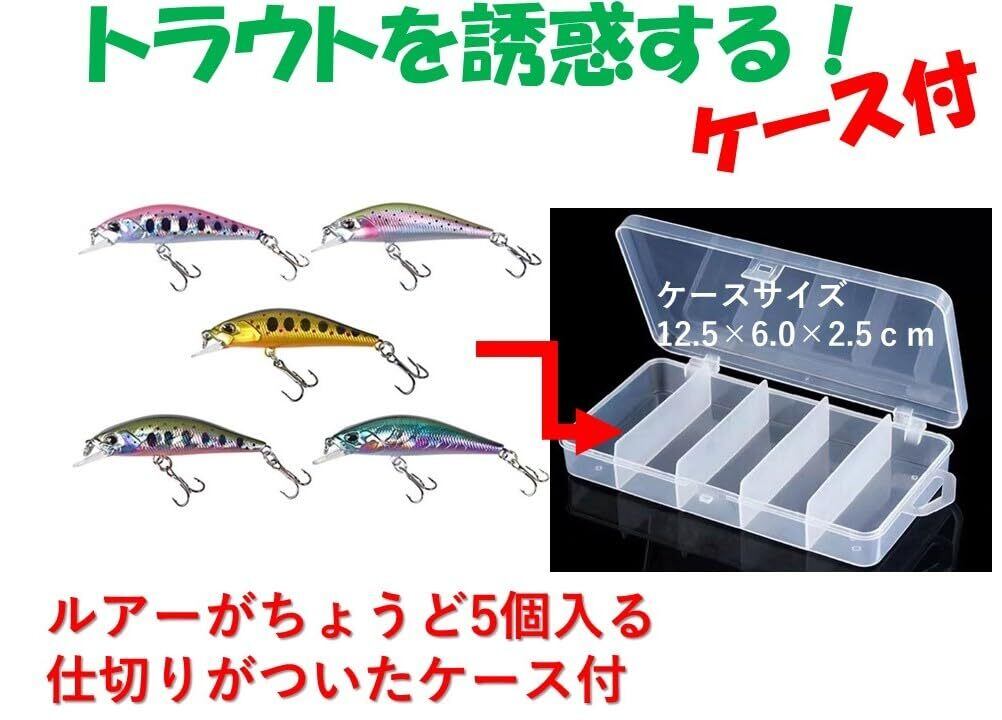 商品内容:重さ:3.5g ボディサイズ:5cm カラー:ヤマメカラー3色とニジマスカラー2色セットの計5色セット フック:トレブルフック ミノーが5個入る専用ケース付