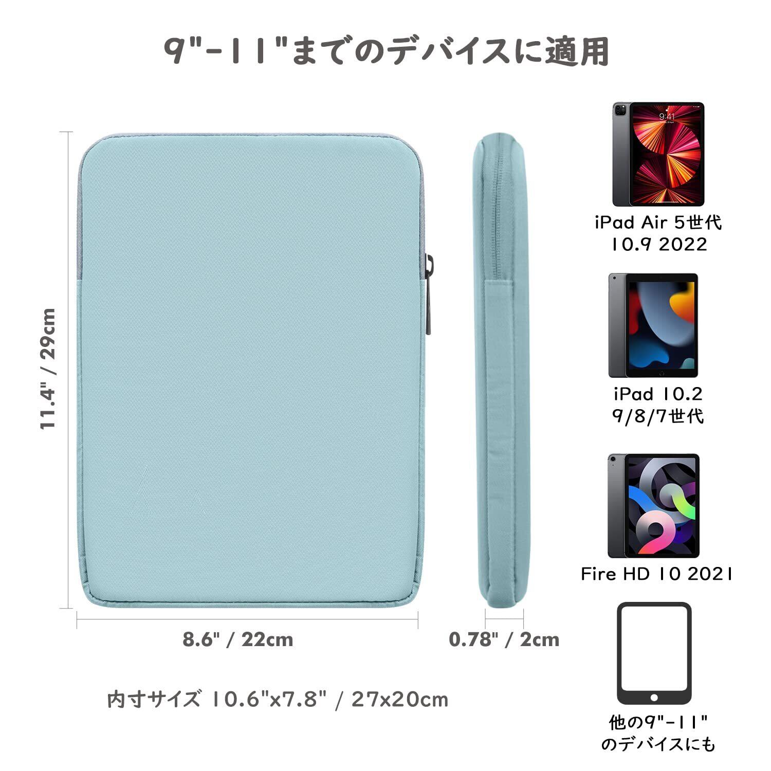 「対応機種」 外部寸法:29 x 22 x 2 cm。9~11インチまでのノート・タブレットPCに適用します。iPad 第11世代 2025、iPad Air/Pro 11インチ(M3/M2)、iPad 第10世代 2022、iPad mini 第7/6世代、iPad Air 10.9インチ 第5/4世代、iPad 第9世代 10.2 2021、iPad 第8世代 10.2 2020、iPad 第7世代 10.2インチ 2019、iPad Air(第3世代) 10.5インチ2019、iPad Pro 11インチ(2018/2020/2021)、iPad Pro 10.5インチ 2017、iPad 9.7 第6/第5世代(2018 / 2017)、iPad 1/2/3/4、iPad Air / Air 2、fire HD 10 / 10 Plus、Surface Go 等に適用します。ご購入の際に、機種とサイズを予めご確認ください。