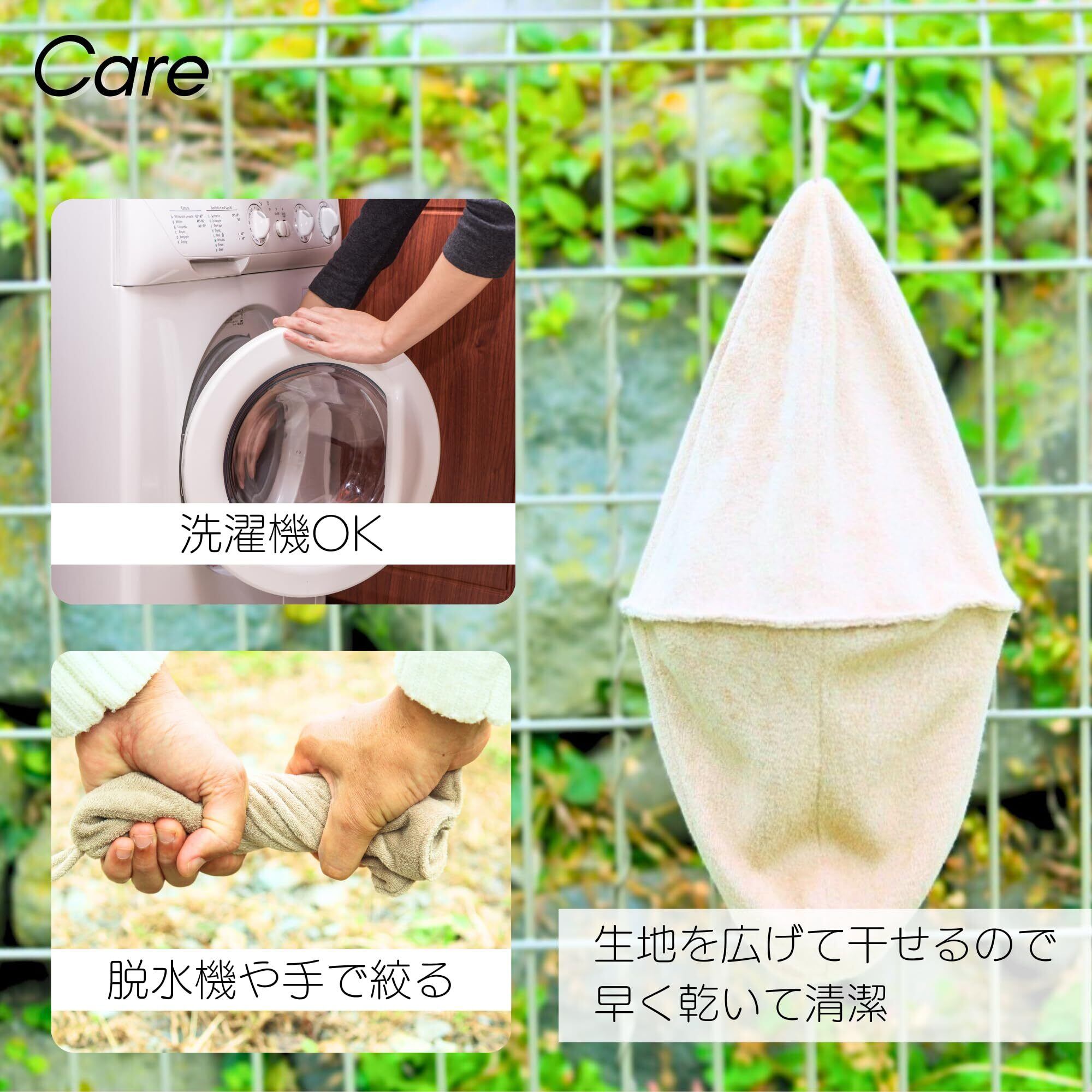 2枚重ねのタオル生地が乾燥と高温から髪をダメージから守り、のぼせ防止に効果的。濡らせば保湿効果がさらにアップします。