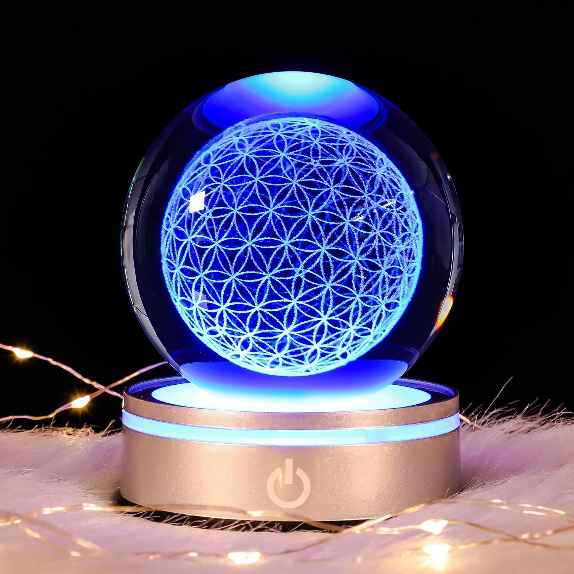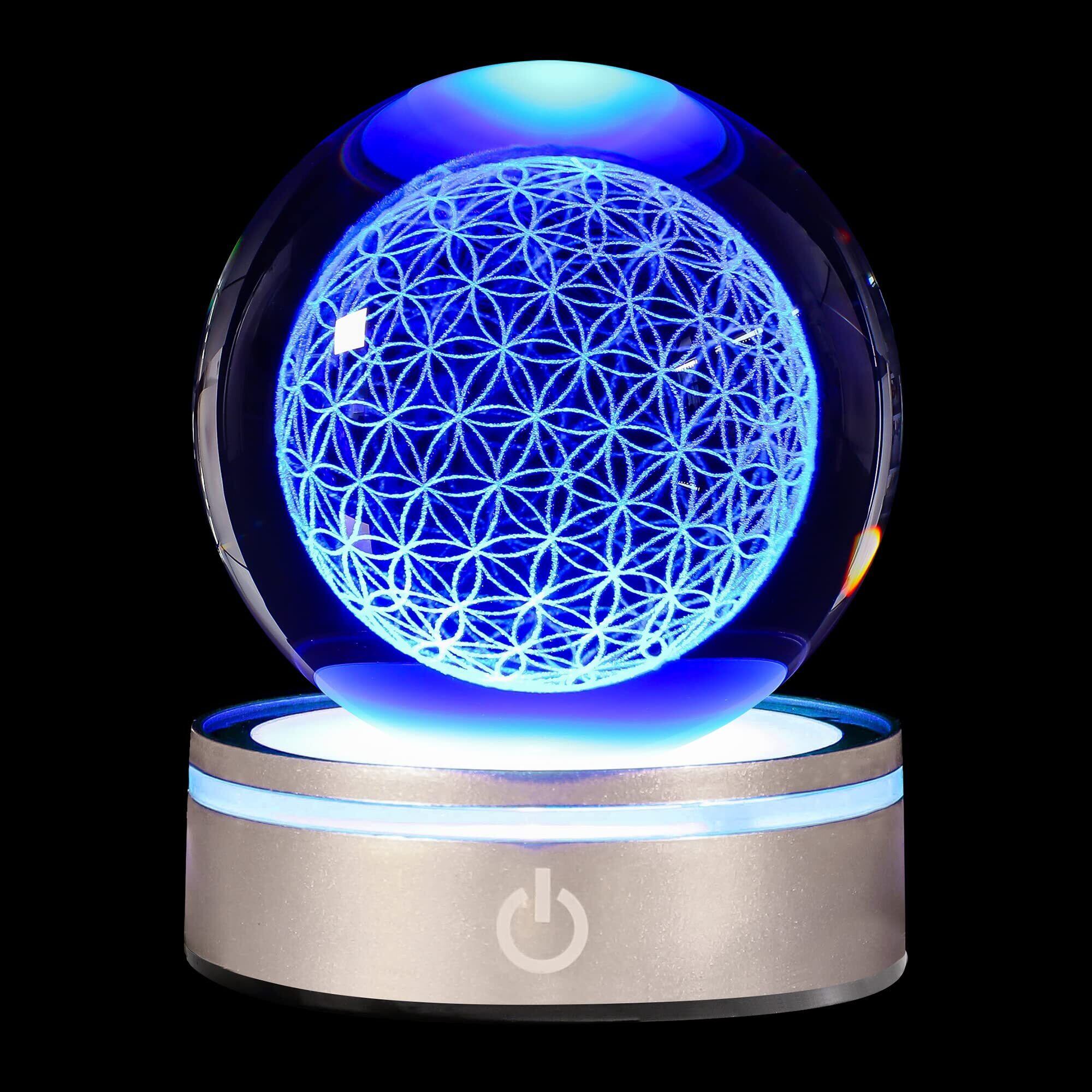 3D 高級花の命のクリスタルボール LED カラフルライティング タッチベース、チャクラ浄化ヒーリンググリッド フラワーグローブ スピリチュアルデコレーション用、球内の花の探求 レーザー彫刻