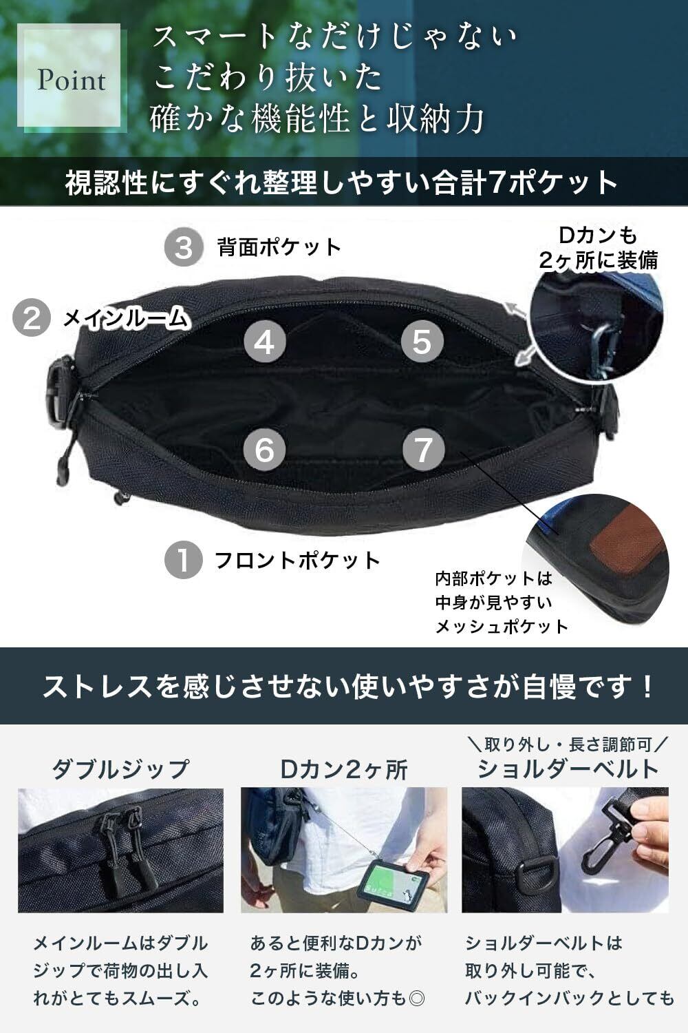 【軽量コンパクトながら充実した収納の秘密】 本体重量は約150gと超軽量で疲れにくい。 ミニショルダーバッグには希少なフロントポケット、メインポケット、背面ポケットの大きく3つの収納があり。 メインポケットにはSwitchやA5サイズまで収納可能。背面ポケットはマグネット式で、パッと出し入れする物の収納に適しています。 またメインルーム内と背面ポケット内にはDカンも装備 鍵のポジションも決めれて使い勝手が更にアップ!