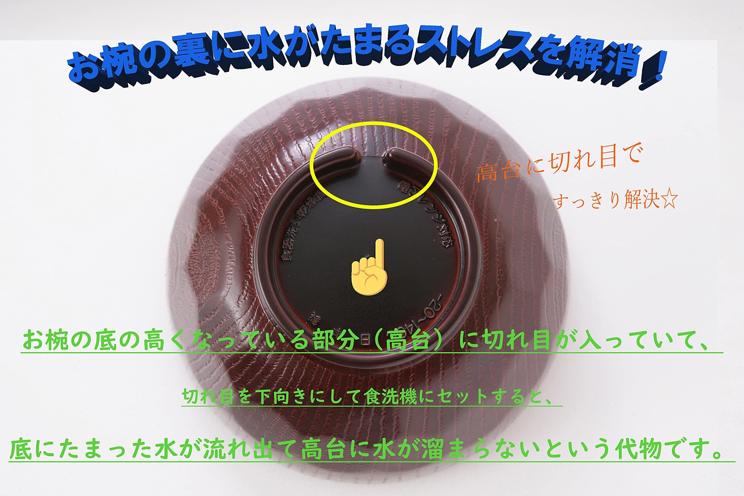 電子レンジ・食洗機対応です。高級感のある溜め塗り技法で、外側の凹凸が塗り加工した際に、色の濃淡が出る技法です。裏面には安心して使える刻印が入っています。高台に切り込みがありますので、水切れが良いです。温め過ぎは突沸の恐れがあるので注意して下さい。電子レンジ600Wで3分または1000Wで1分以上の加熱、油分の多い調理使用・空焚きはお避け下さい。耐冷熱温度:-20℃~140℃。汁椀以外は商品ではありません。