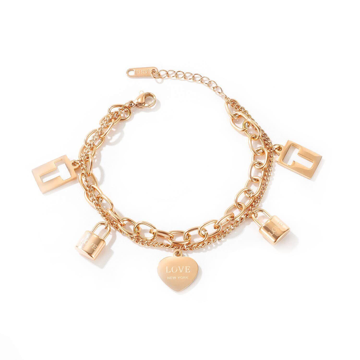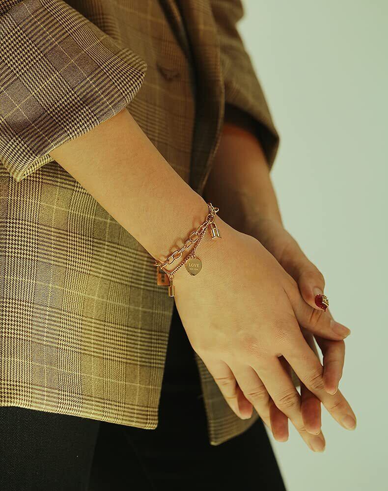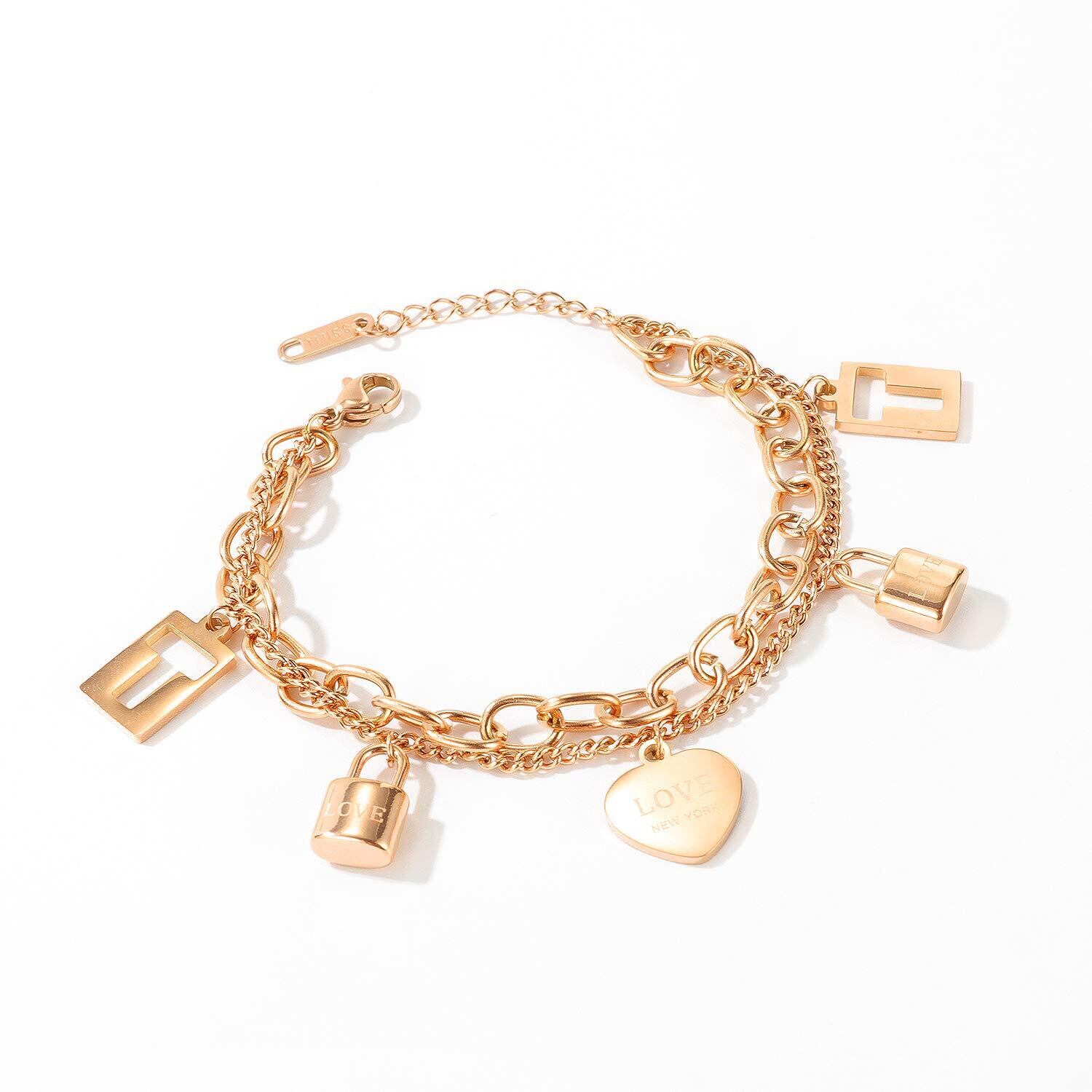 ブレスレット レディース ピンクゴールド イニシャル 文字 刻印 鍵 ハートブレスレット おしゃれ 2連チェーン ステンレス製腕輪 仕上げ 金属アレルギー対応