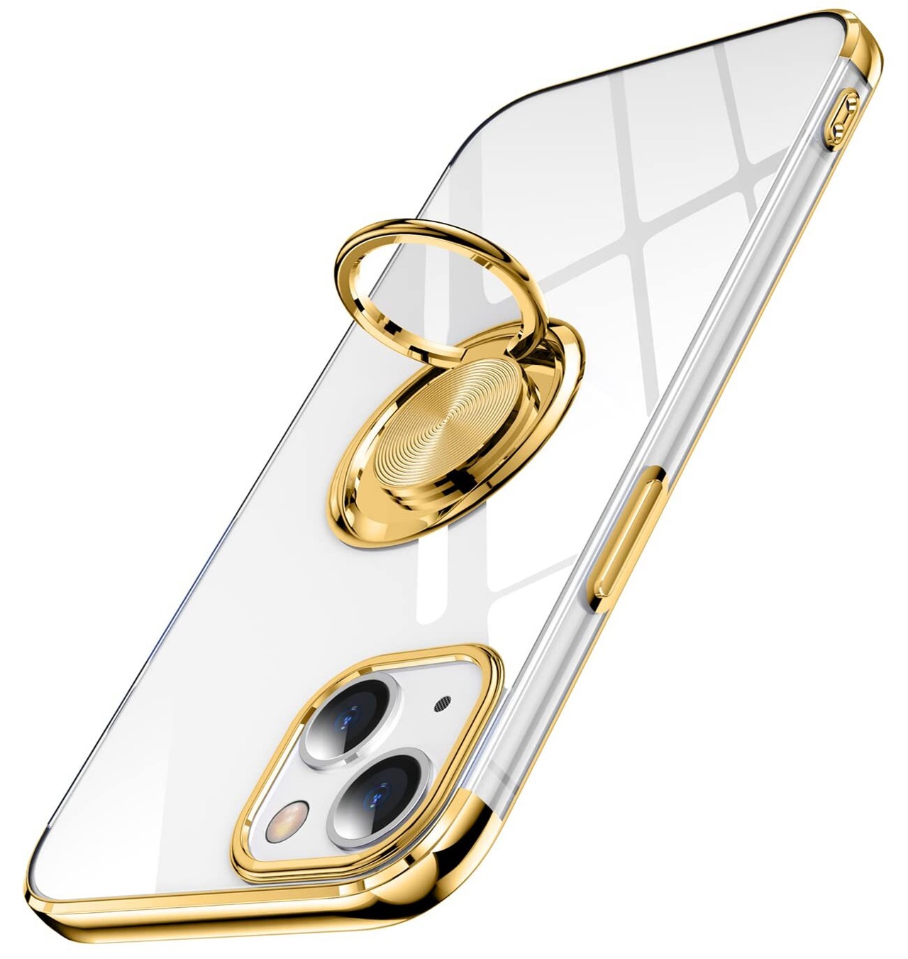 iPhone 14 用 ケース クリア リング付き アイホン 14 カバー 透明 おしゃれ OURJOY スマホケース メッキ加工 ソフトケース 耐衝撃 軽量 薄型 ストラップホール付き スタンド機能 車載ホルダー対応 携帯ケース • ゴールド
