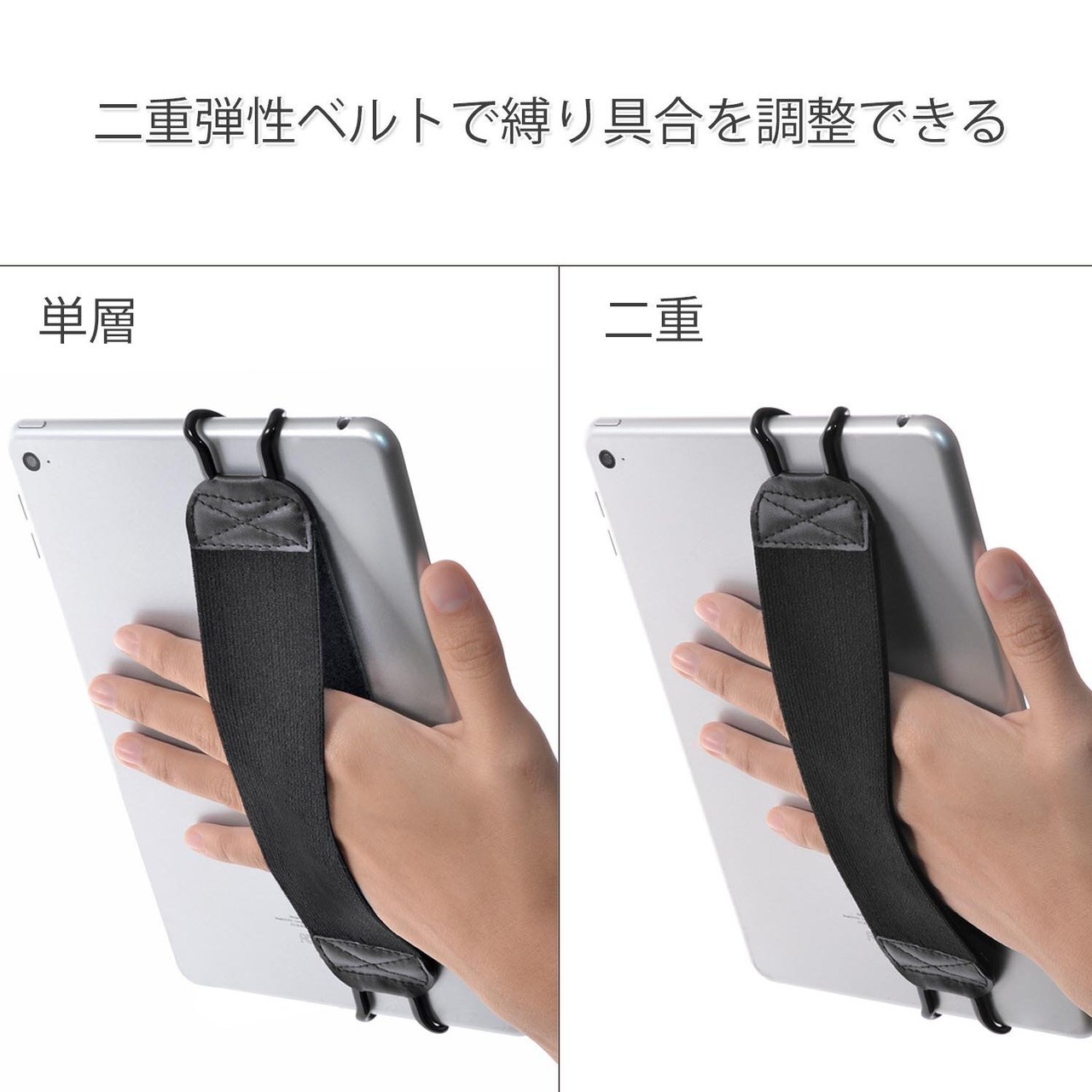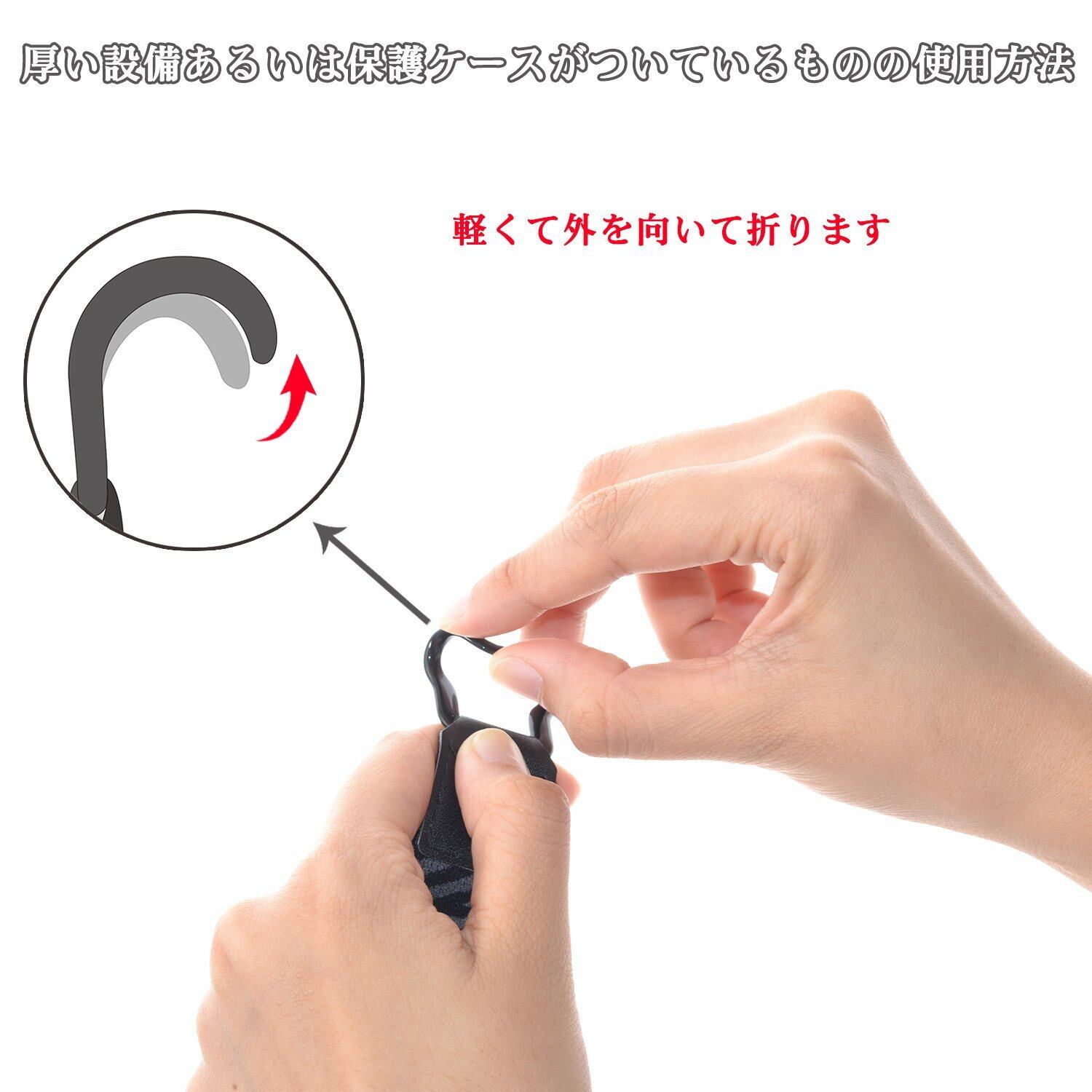 ストラップの取り付けや取り外しが簡単ー ヒント: 留め具を少し強めに広げることで、厚めのタブレットやカバー付きタブレットホにも 取り付けることができます。