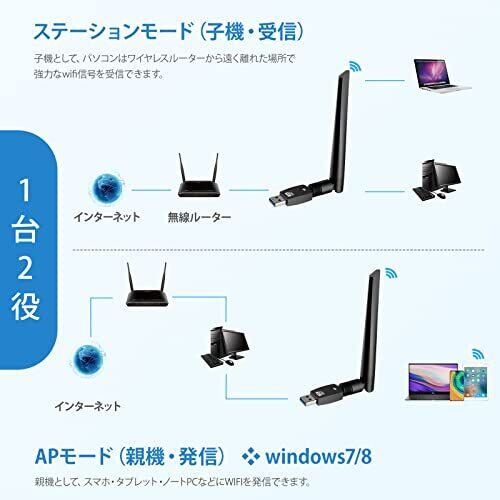 【親機子機&1台2役】 KimwoodのWi-Fi アダプターはステーションモード「子機・受信」とAPモード「親機・発信」があります。子機モードでは、コンピューターは有線ケーブルなしでWi-Fiを受信できます。 親機モードでは、無線子機はWIFI信号を発信して、スマホ、iPad、ラップトップなど設備にインターネット接続を提供できます。※ご注意:親機モード対応するシステム:Windows7/8。親機と子機同時に使用することは不可です。