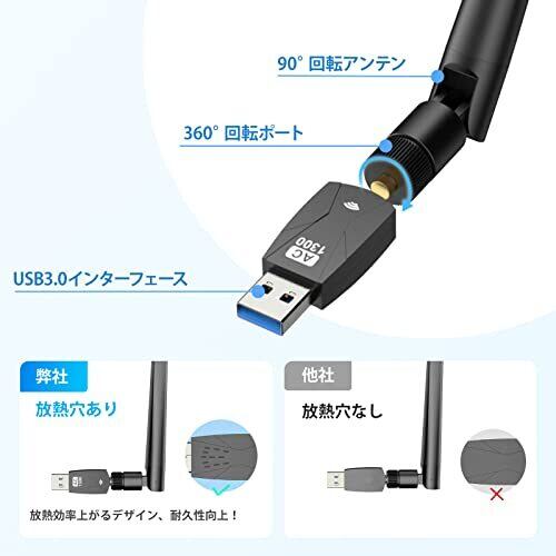 KIMWOOD wifi usb 1300Mbps USB 3.0 無線lan 子機 2.4G/5G デュアルバンド 5dBi超高速通信 wifi 子機 360°回転アンテナ Windows11/10/8/7/ XP/Vista/Mac OS対応 アダプター 802.11ac/n/a/g/b技術 日本語取扱説明書 認証済み