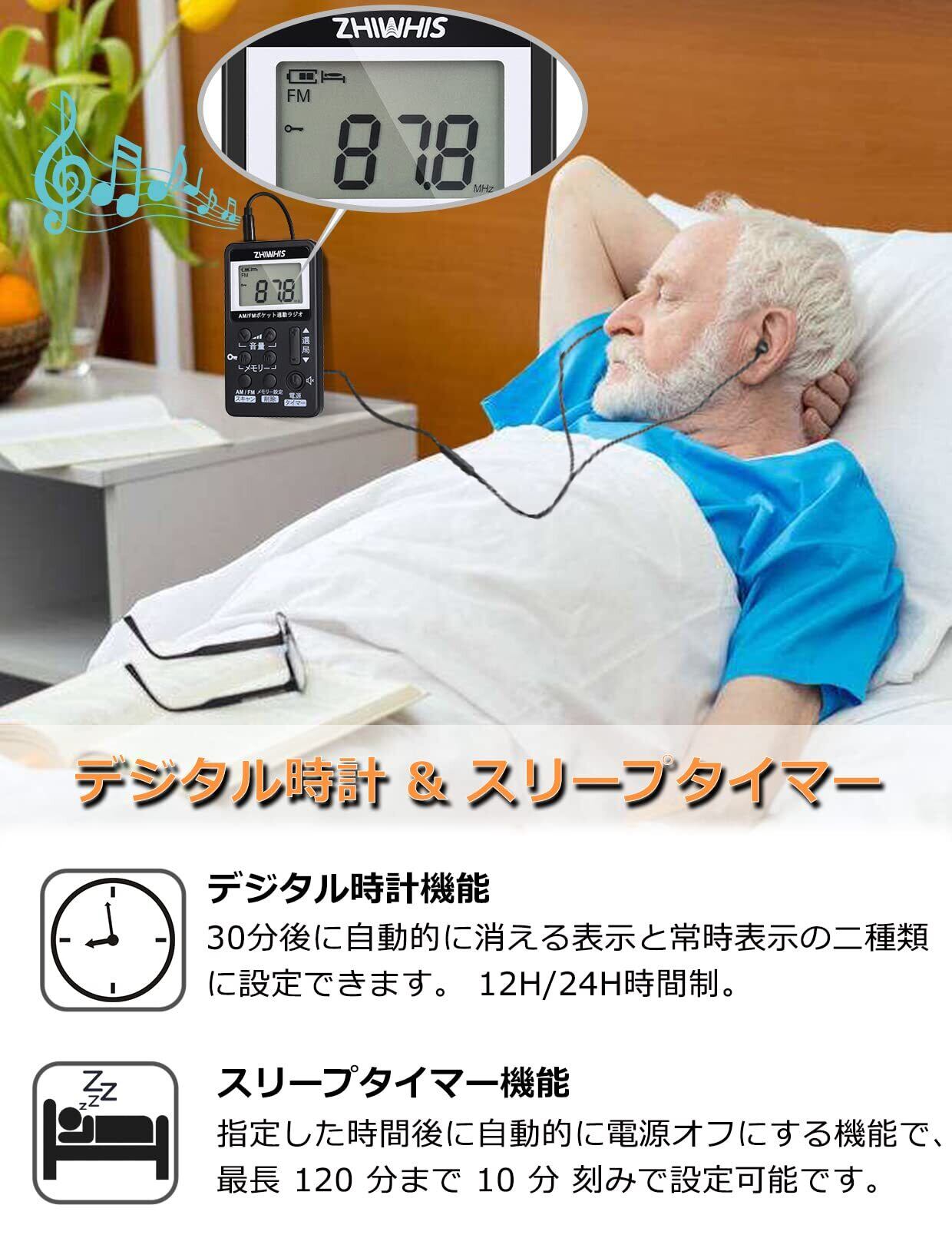 ZHIWHIS 携帯ラジオ 小型充電式 タイマー/デジタル時計付き AM/FM/ワイドFM対応 DSP高感度ステレオ受信機 キーロックとプリセット機能付き 防災 通勤 旅行 運動用 日本語取説&保証書付き 黒 ZWS-103