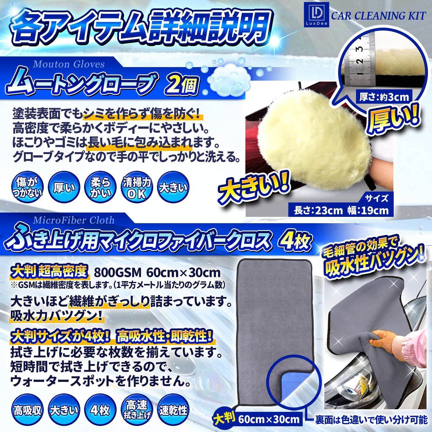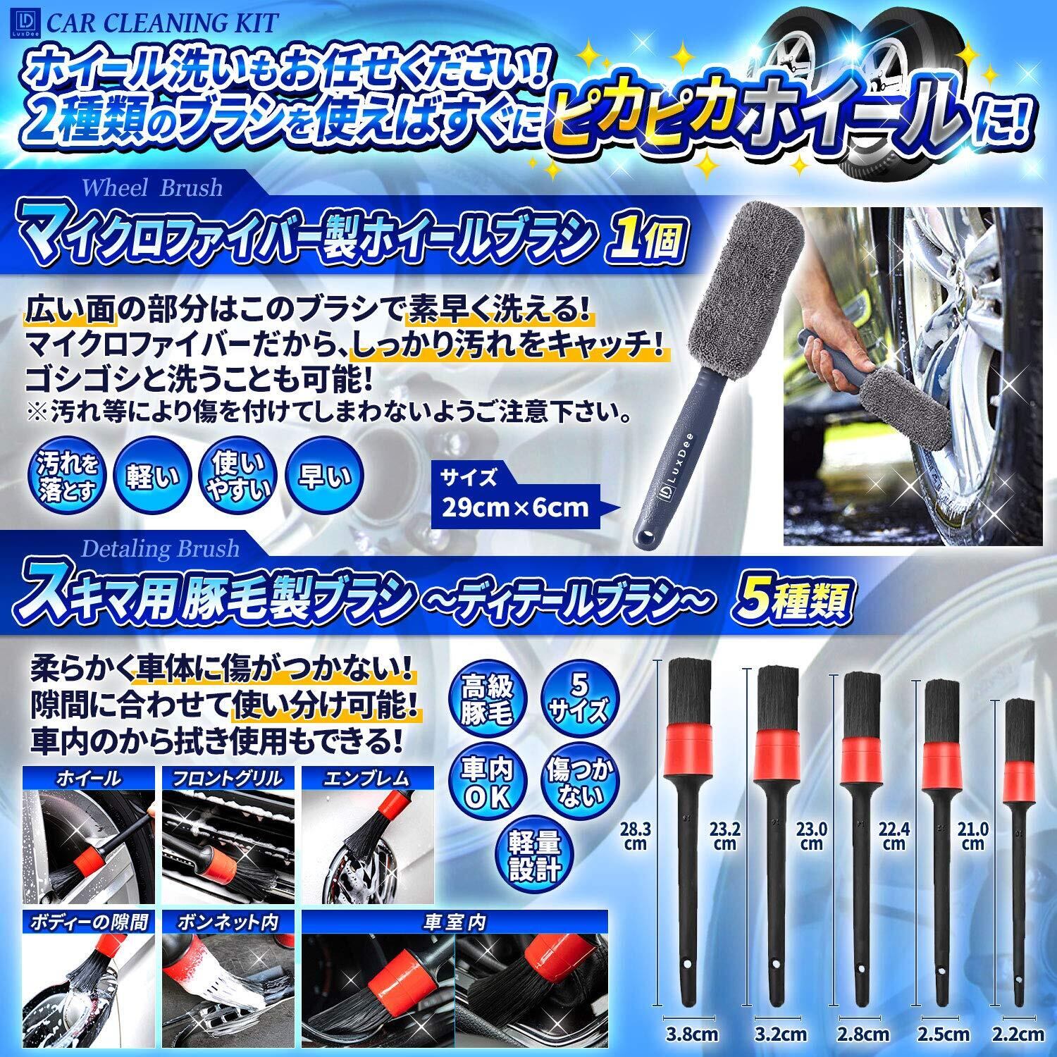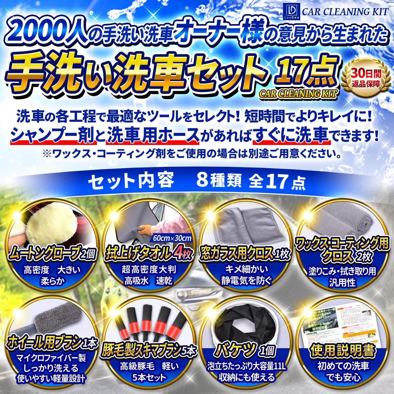 【特盛り!!洗車17点セット内容】 ●ふき上げ用タオル(60cm x 30cm 800GSM) 4枚 ●ムートングローブ 2枚 ●豚毛製ブラシ 5本サイズ別(ディテールブラシ) ●ホイール洗車用マイクロファイバー製ブラシ 1本 ●ワックス、コーティング塗り込み・仕上げ用クロス 2枚 ●窓(ガラス)用クロス(40cm x 30cm) 1枚 ●折り畳み式バケツ 容量11リットル ●使用説明書(洗車の手引書)