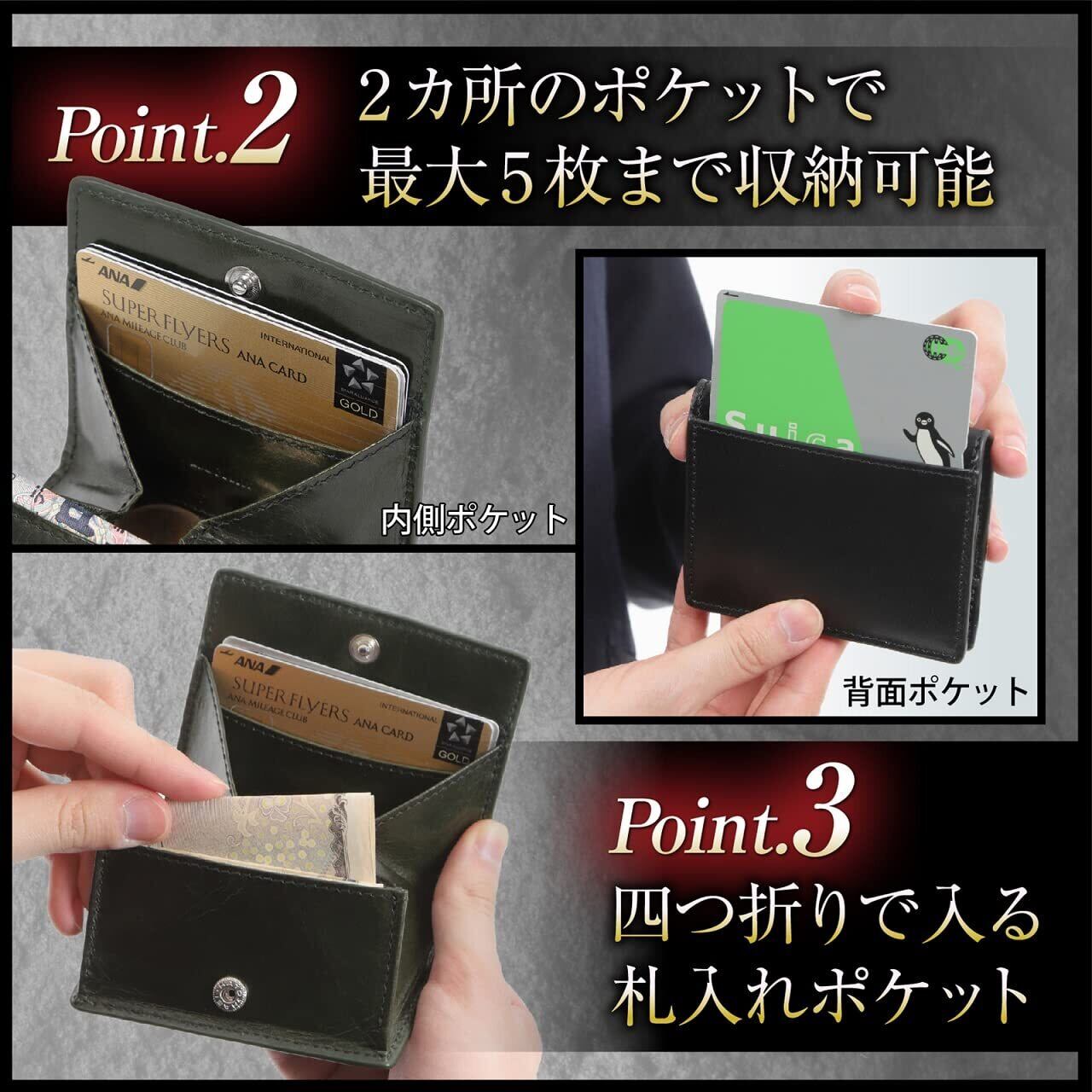 【2カ所のカード入れ】内側に3枚、背面に2枚、最大5枚のカードが収納できます。普段使いのクレジットカード、交通系カード、免許証、保険証、普段使いの最小限なら5枚収納でOK!