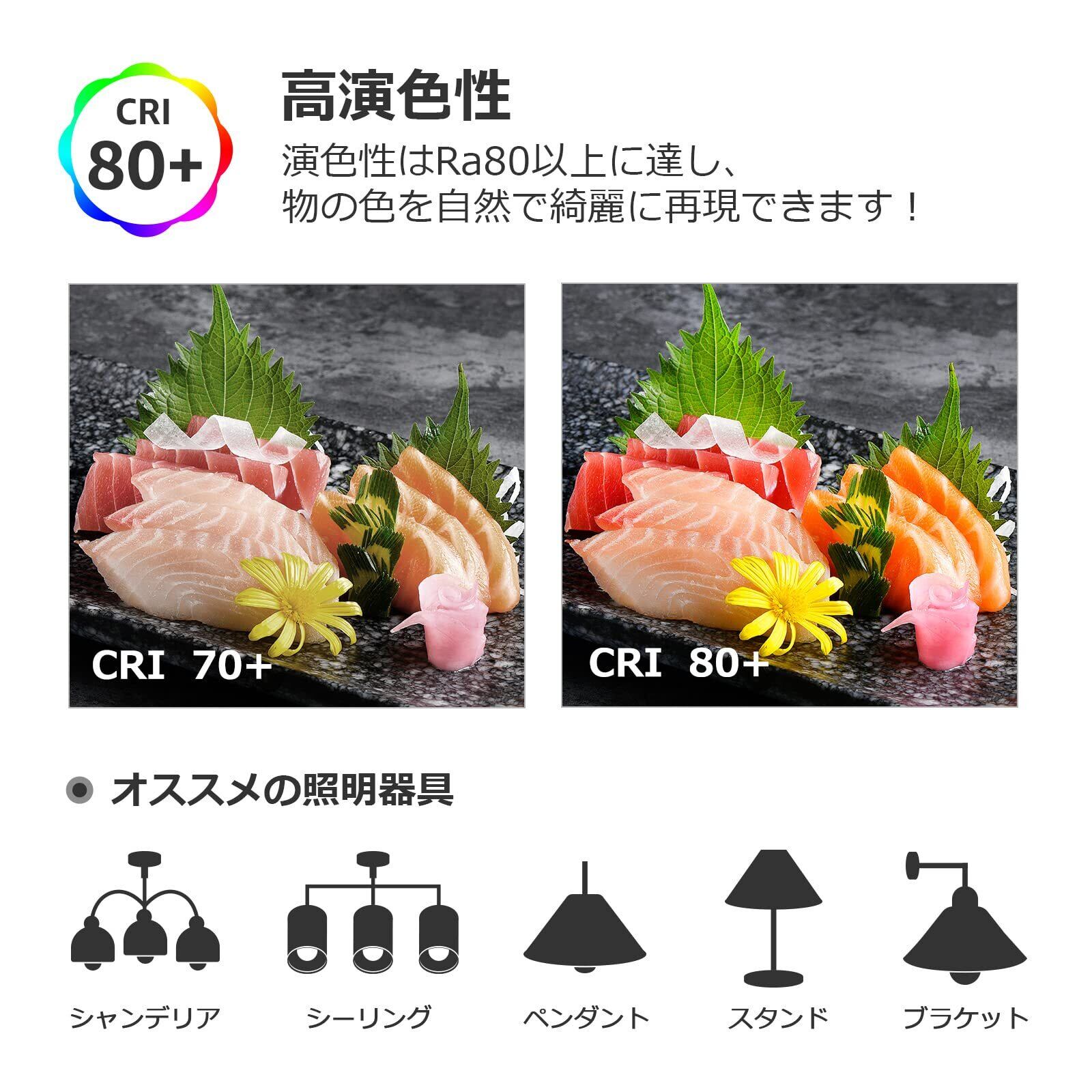 【360°広配光タイプ | 即点灯】スイッチを入れた瞬間に明るく点灯します。赤外線と紫外線はほとんど出ないので、虫が寄りにくい。照射角度は360°に達し、広範囲を明るく照らすことができ、リビング・ダイニング・キッチン・レストランなどの照明に最適です。またはペンダント器具や天井器具などにも使用可能です。