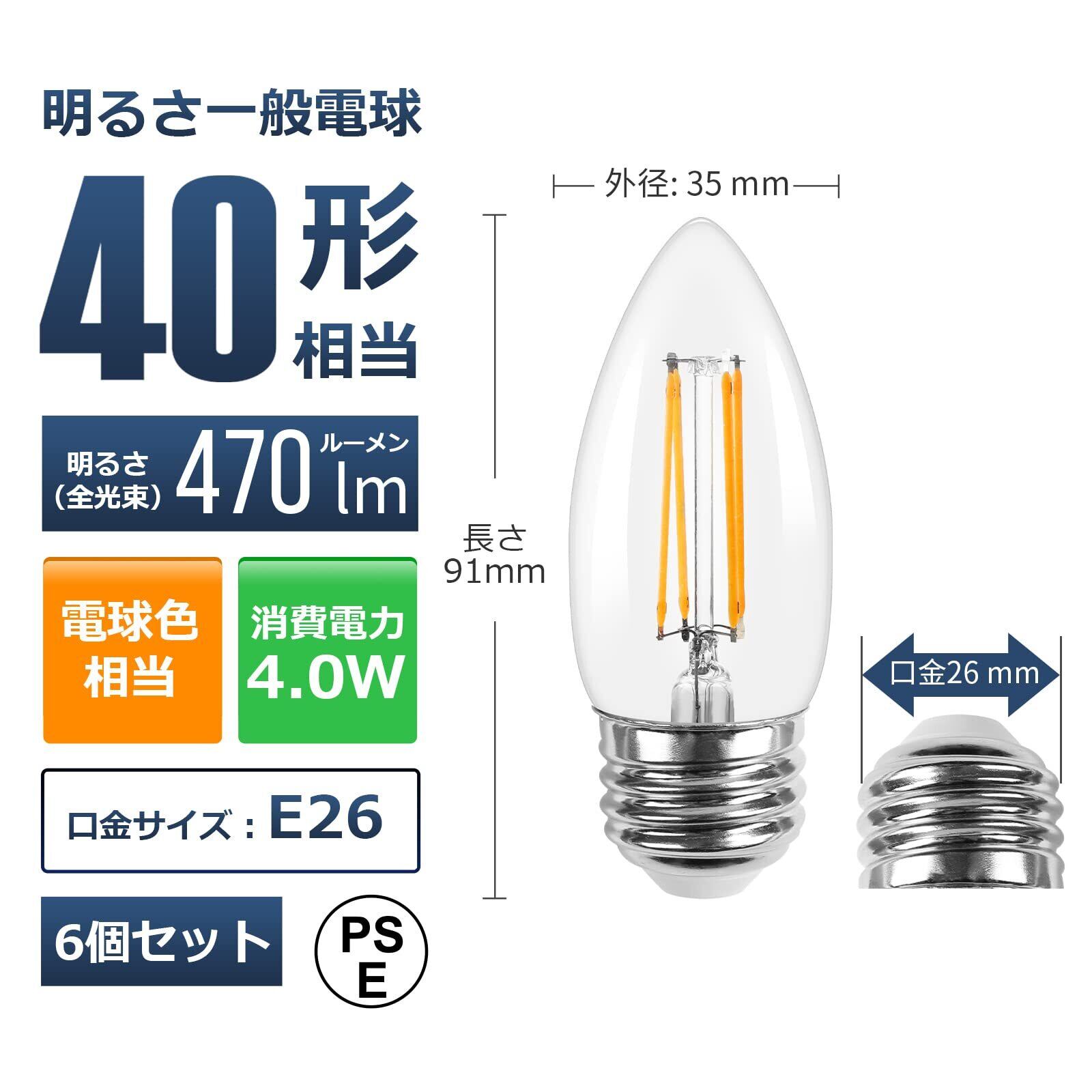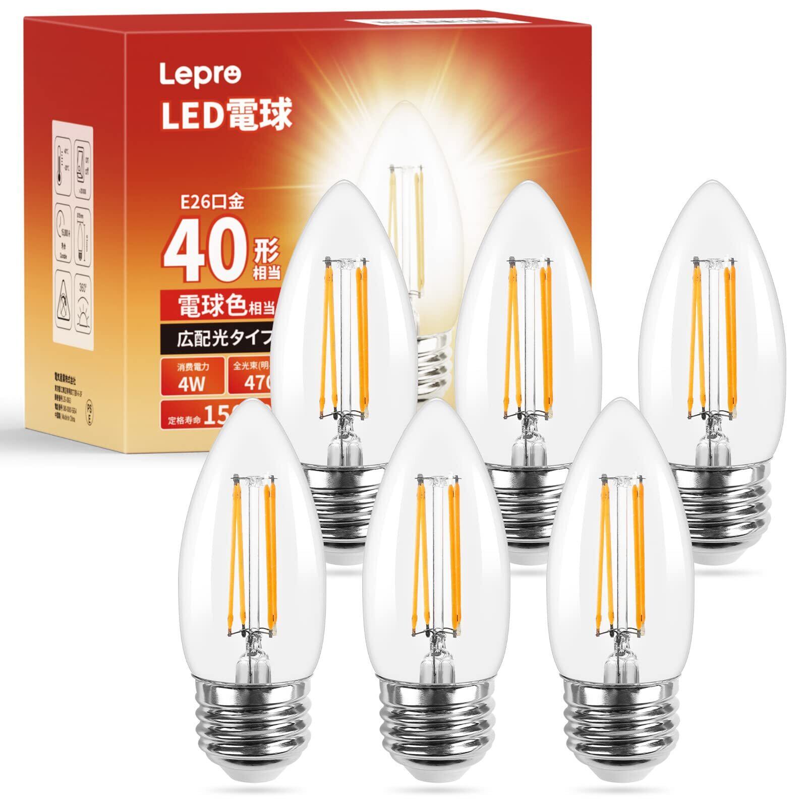 【E26】Lepro LED電球 E26 40W形 6個入り シャンデリア電球 口金直径26mm C35 電球色 2700K キャンドル フィラメント 360° レトロ 高演色性 クリアタイプ 密閉器具対応 4W 省エネ チラツキ少ない シャンデリア風 蝋燭型 led照明 日本PSE認証済