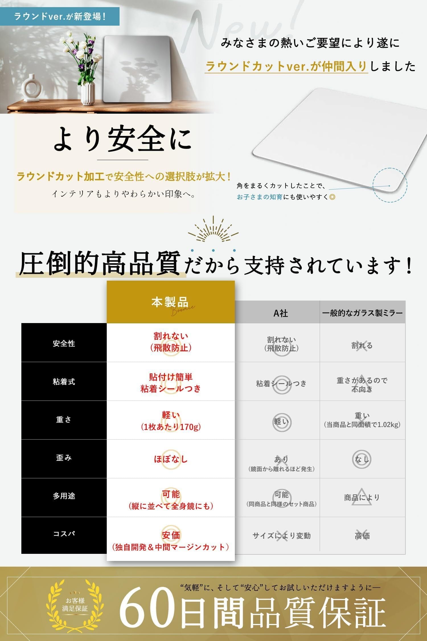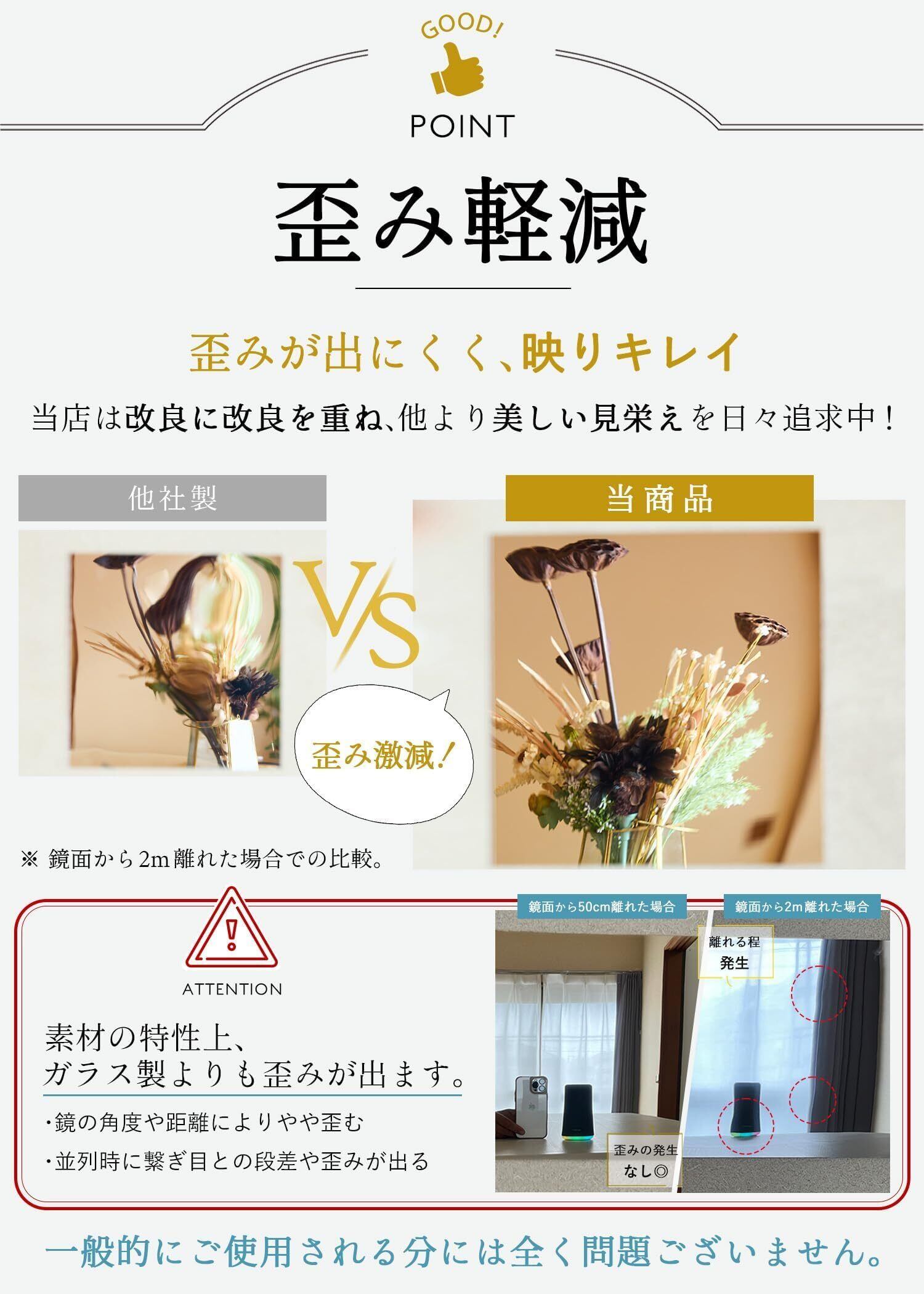 ※一般的な壁紙には対応しておりますが、凹凸が大きい壁紙やデリケートな壁紙には適しておりません。 凹凸が大きい壁紙には養生テープなどで凹凸をなるべく平らにし、両面テープの粘着面積を増やしてご使用ください。 ️万が一、商品が破損して到着した場合は、お気軽にご連絡ください。 到着時に破損していたミラーについては、返品なしで全額返金または無料交換いたします。