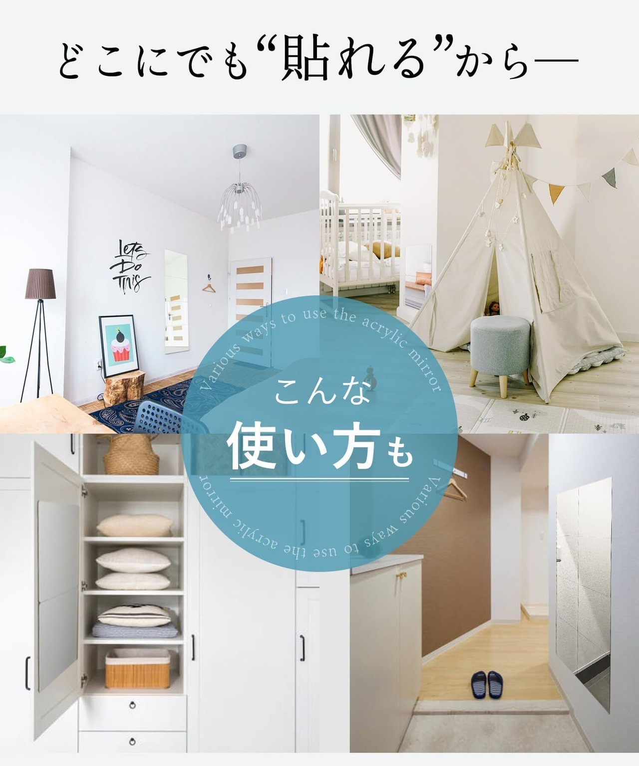 【様々な活用術】クローゼットやドアのウラ、浴室など普段の身だしなみチェックがスムーズに。割れないので、お子様のお着替えトレーニングにも活用できます。