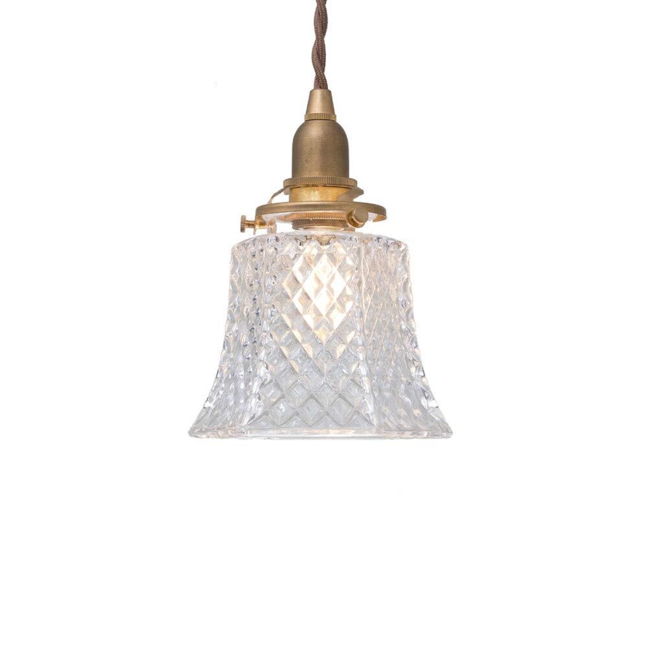 ガラスのペンダントライト:ダイヤ模様が輝くガラスのペンダントライト。ガラスの凹凸より動きのある綺麗な光が生まれ、消灯時でも目立つ存在です。
