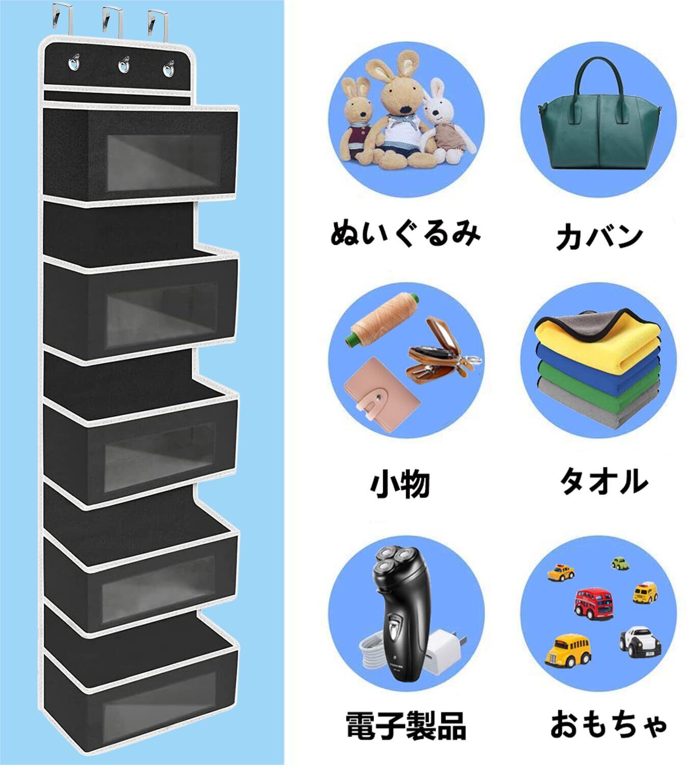 【吊り下げ収納 省スペース】-- ドア、壁、クローゼットに掛けて使える吊り下げ収納ポケットです。ドア掛け収納式ポケットは簡単に吊り下げられます。片づけの苦手な方でも、入れるだけで、しかも見やすいので、簡単に片づけ上手になれます。