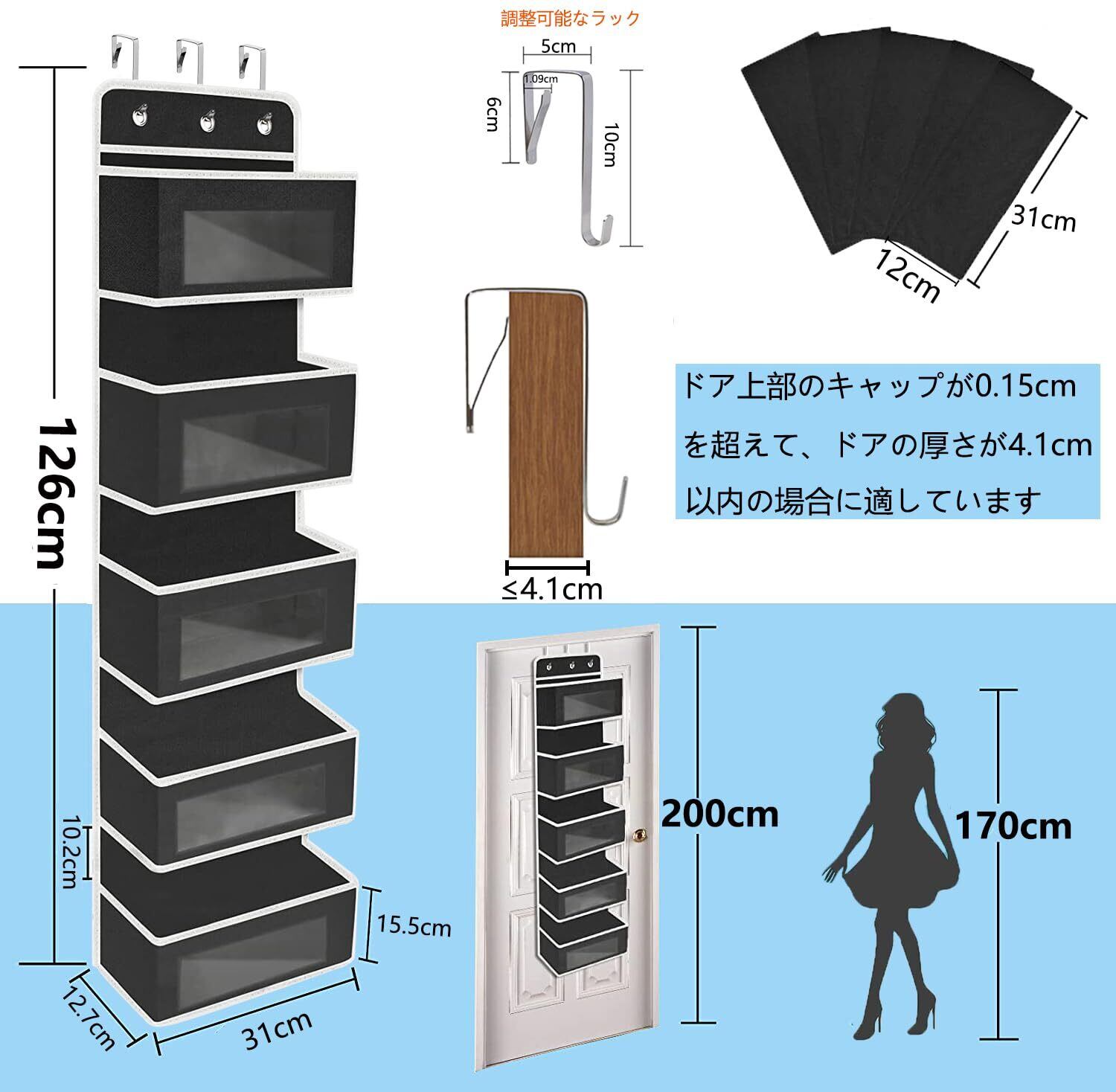 【5段の大容量と透明窓付きの設計】-- 五段のウォールポケットで、普通の製品より一つのポケットが多く、化粧品、ぬいぐるみ、タオルなど多くの雑貨を収納できます。透明窓付きの設計なので、収納されているものを見えやすく、財布やカバン、スカーフ、ヘアアクセサリー、おもちゃ、雑誌 などの出し入れも便利です。サイズ(折りたたみ):32×27×7cm。サイズ(展開):126×31×12.7cm。