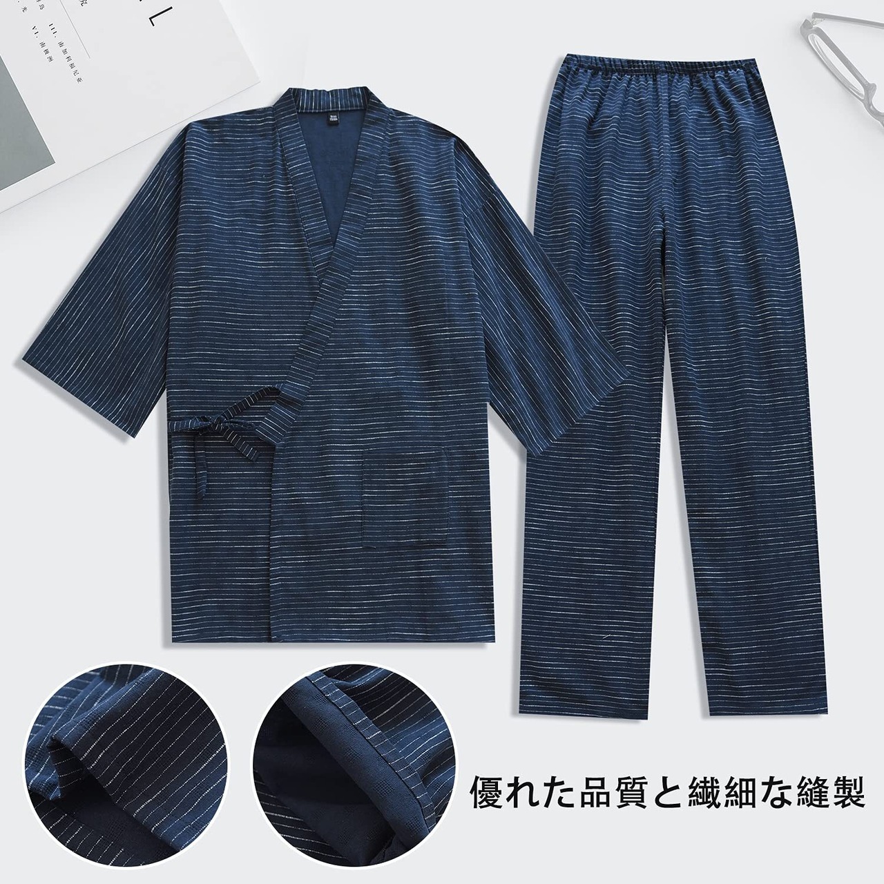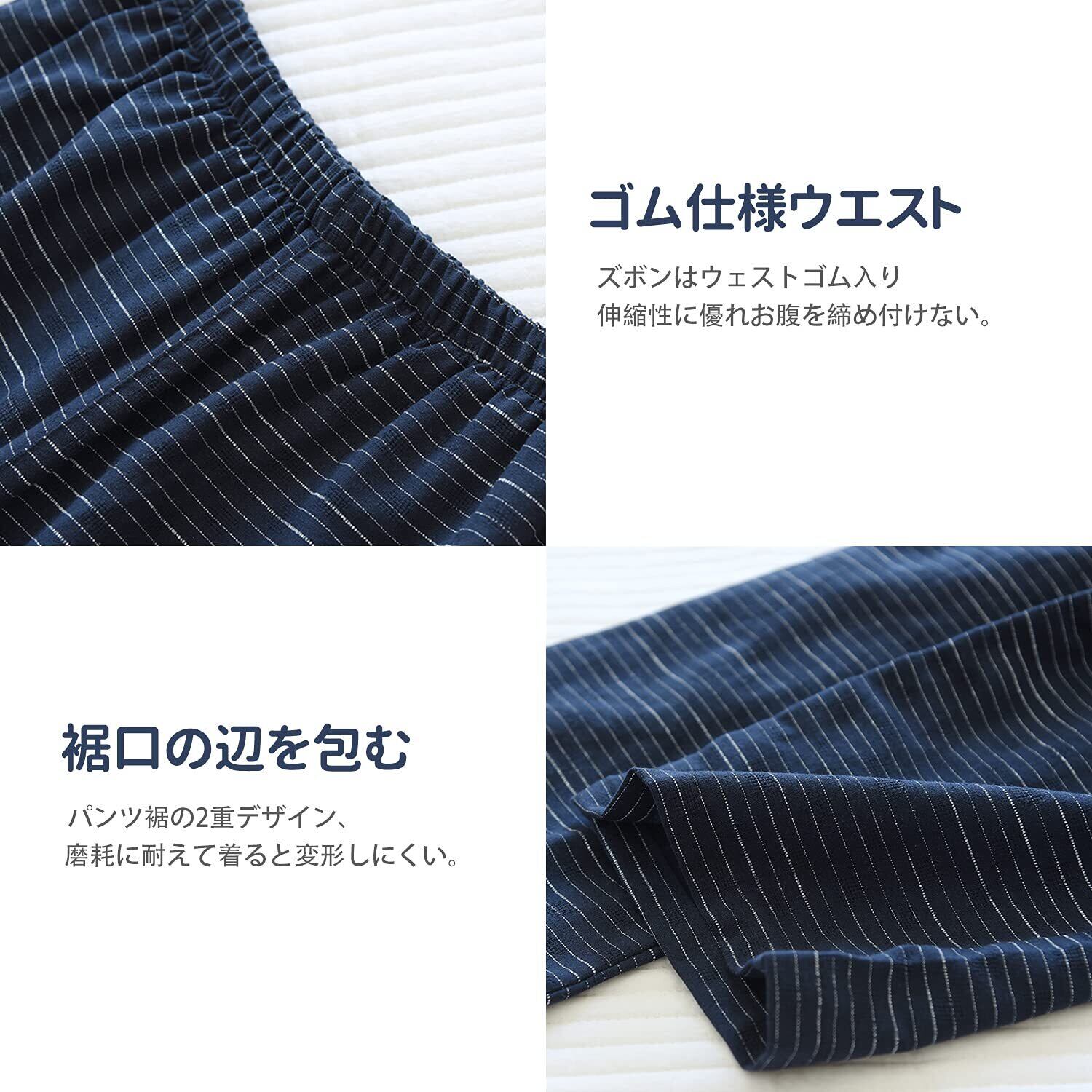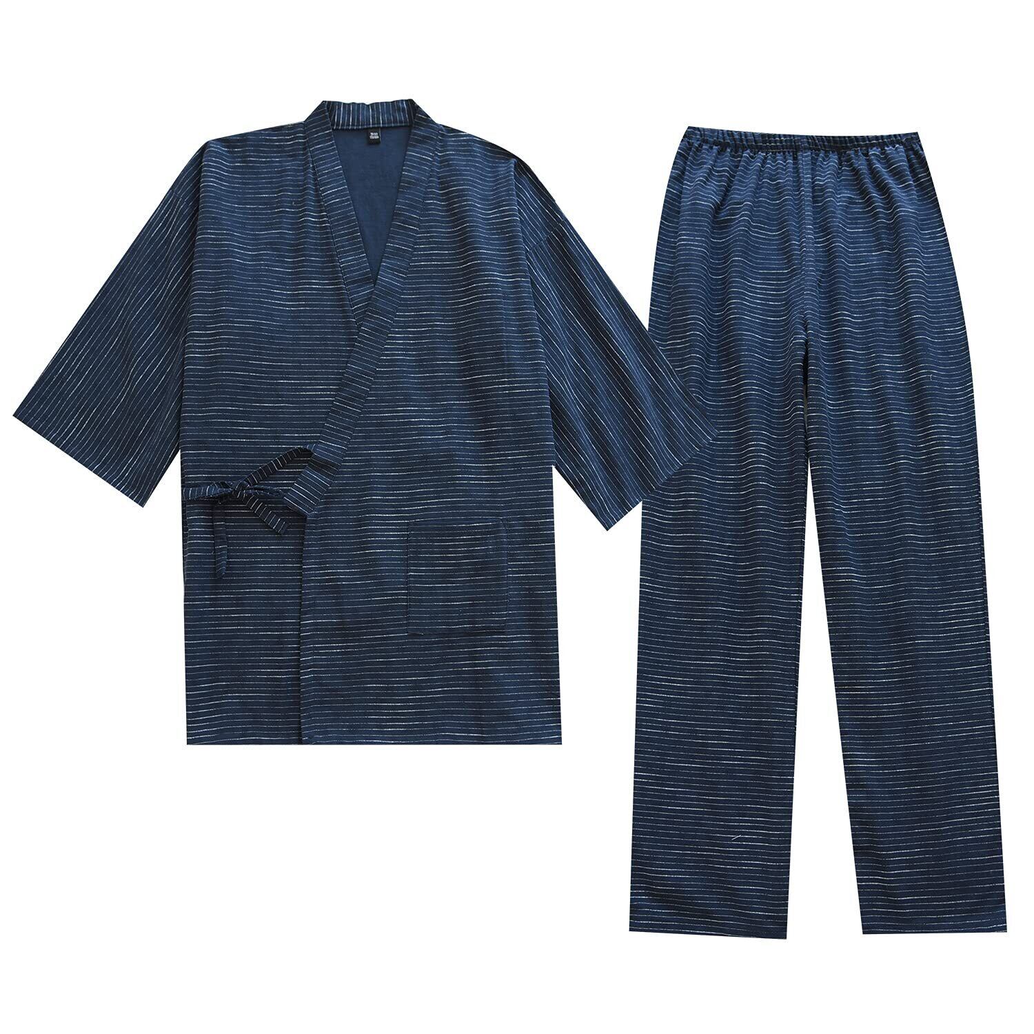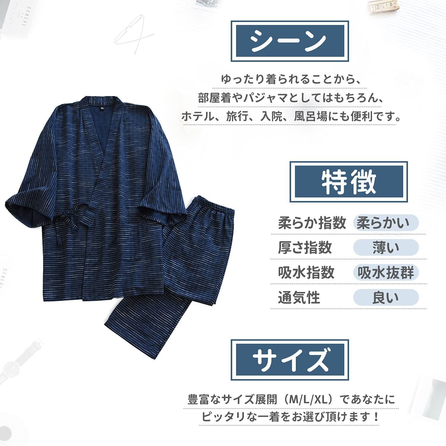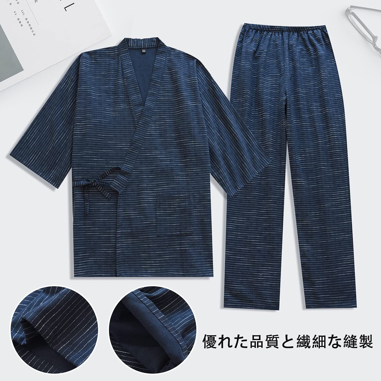 [Comfort U] 作務衣 メンズ 浴衣 甚平 7分袖 寝間着 綿100% 二重ガーゼ メンズのパジャマ セット 紳士甚平 縞模様 通気性 吸汗 和柄 和服 春夏用 ルームウェア ポケット付き 父の日 贈り物 (XL, ブルー)