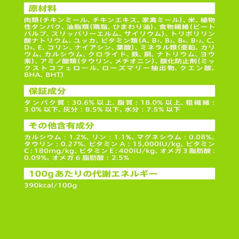 原材料:肉類(チキンミール、チキンエキス、家禽ミール)、米、植物性タンパク、油脂類(鶏脂、ひまわり油)、食物繊維(ビートパルプ、スリッパリーエルム、サイリウム)、トリポリリン酸ナトリウム、ユッカ、ビタミン類(A、B1、B2、B6、B12、C、D3、E、コリン、ナイアシン、葉酸)、ミネラル類(亜鉛、カリウム、カルシウム、クロライド、鉄、銅、ナトリウム、ヨウ素)、アミノ酸類(タウリン、メチオニン)、酸化防止剤(ミックストコフェロール、ローズマリー抽出物、クエン酸、BHA、BHT)