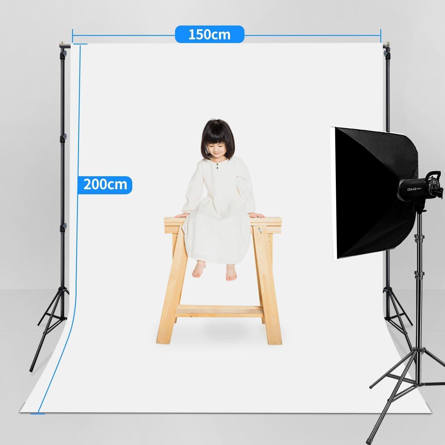 先端には袋縫い加工、背景スタンドのポールを直接に差し込むだけで設置できる白布で、使いに便利です。クロスバーは直径60mmまでに対応します。