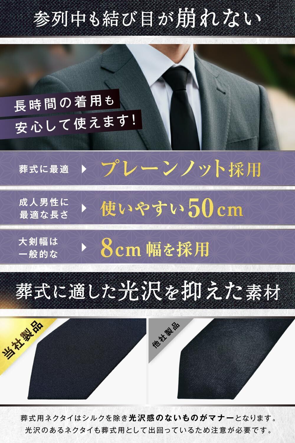 【 葬式 に適した非光沢素材 】 黒 の濃さは故人への想いの深さを象徴し、濃いほど良いとされています。結び目はお葬式にふさわしい「プレーンノット」です。