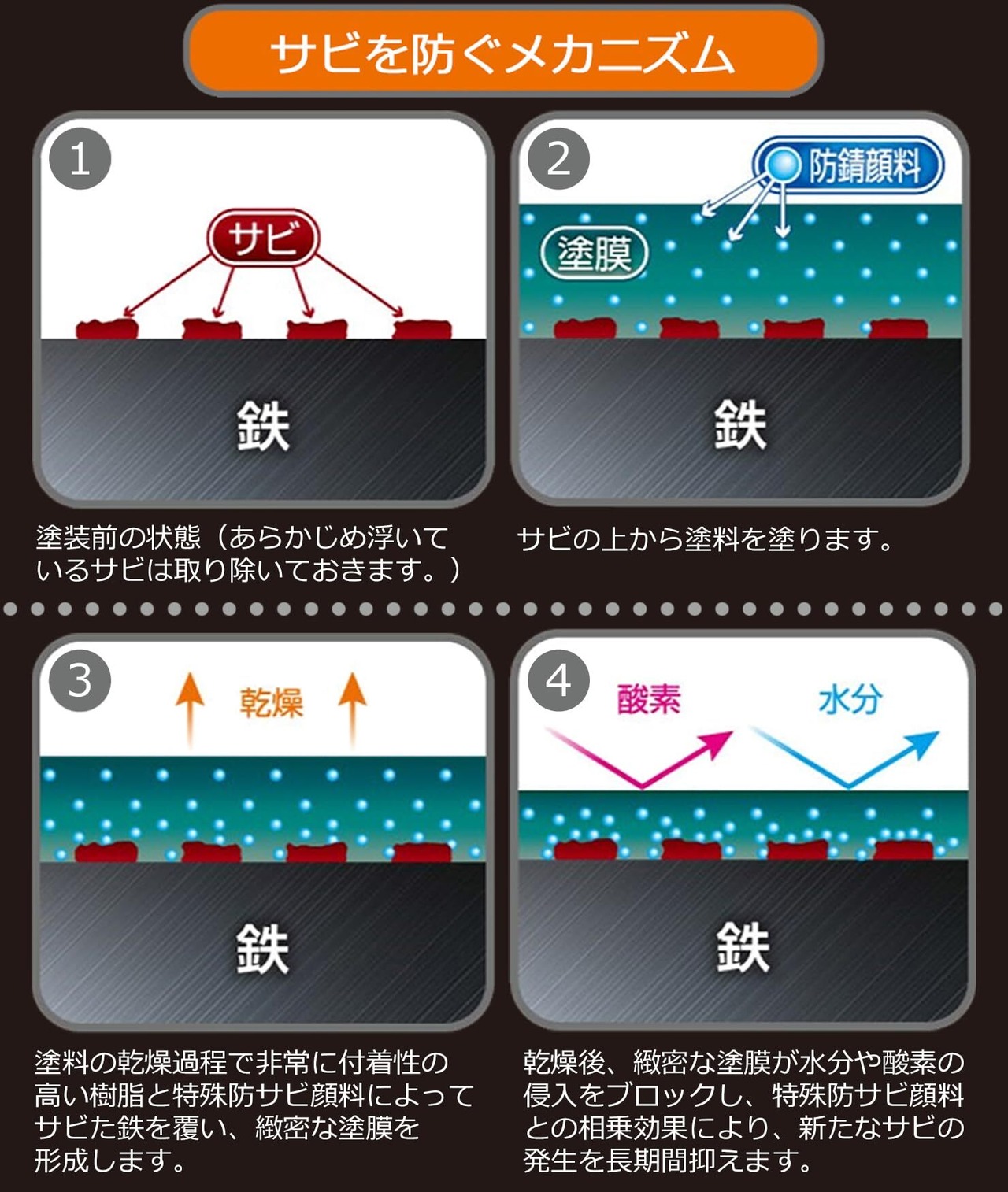 特殊防錆剤の配合により、サビを落とさずサビの上から直接塗れます。
