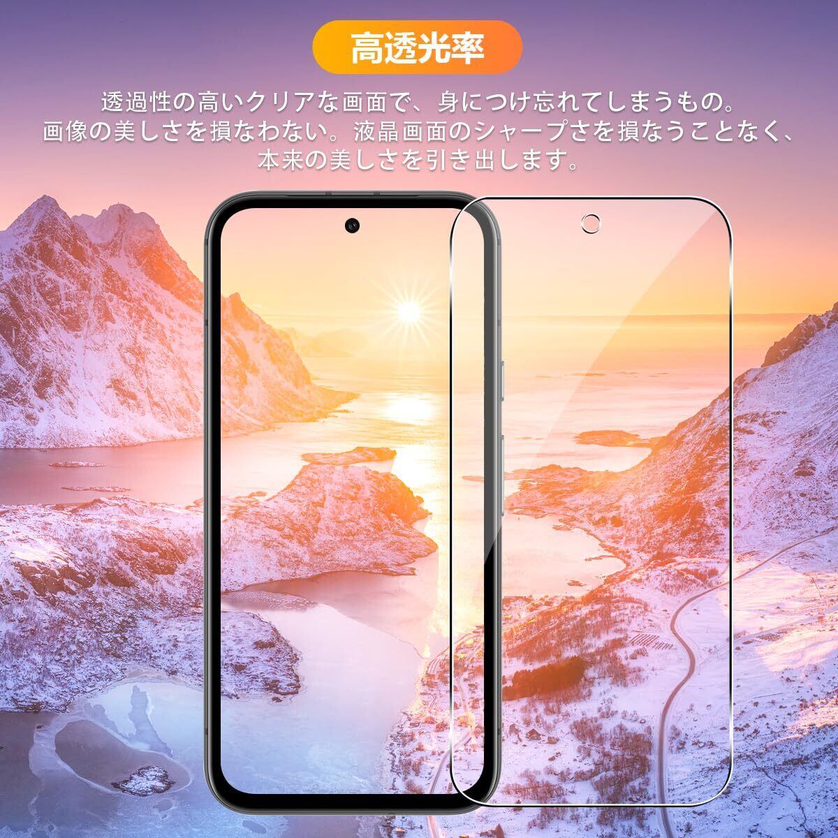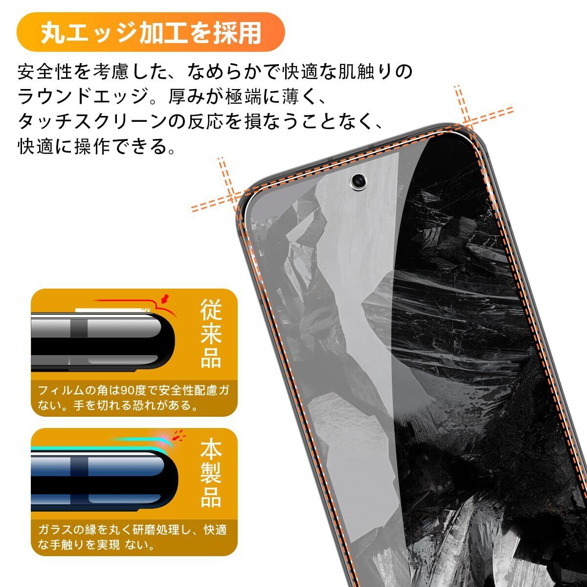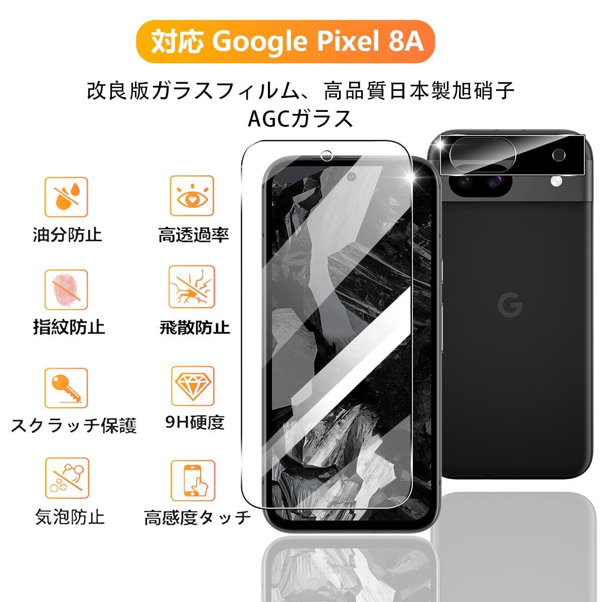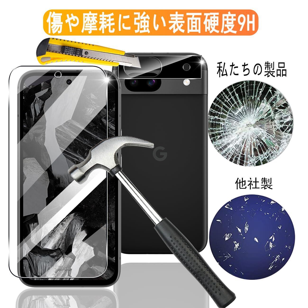 【9H強度&飛散防止】対応 ピクセル8A 強化ガラス 保護フィルムは日本旭硝子素材を採用します。 落下、スクラッチ、衝突、衝撃に高い耐久性があります 衝撃を最小限に抑えて画面の破損を抑え。カッターなどの鋭利なものを当たってもキズが付きにくくて高い強度を持ち表面硬度9Hが特徴です。特殊な飛散防止設計により、万一割れてしまった際にも飛散することなく、高い安全性を実現します。