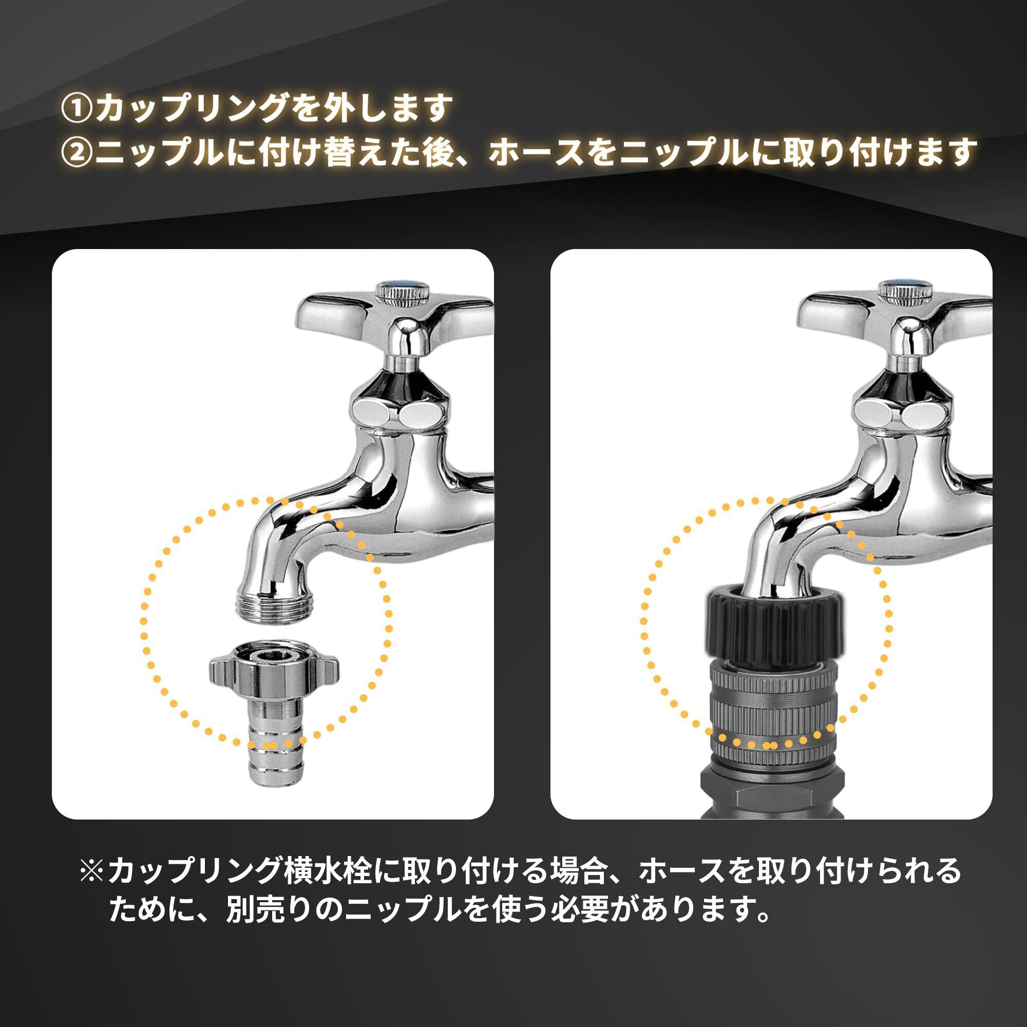 【ご注意】(1)本商品はキッチンや風呂場の蛇口からの使用ではありません。(2)ホースのコネクタはワンタッチタイプではないため、ホースを蛇口に取り付ける前に必ず取扱説明書をお読みください。(3)カップリング付き横水栓を使う場合には別売りのニップルを使用する必要があります。(4)商品パッケージに付属される蛇口用ニップルは直径16mmまでの蛇口の吐水口に取り付けられます。直径16mmより大きい蛇口を使う場合には別売りのニップルを取り付ける必要があります。(5)蛇口用ニップルが取り付けている状態で、蛇口との間から水漏れが発生する場合、蛇口用ニップルを蛇口の吐水口のセンター部に意識して真っ直ぐ押し込み、周囲のネジ(3ヶ所)を更に均等に締め込んでセットしましたところ、水漏れはなくなります。(6)冬に気温が氷点下の環境で散水ノズルを保管しないでください。低温環境で散水ノズルが破損しやすいです。