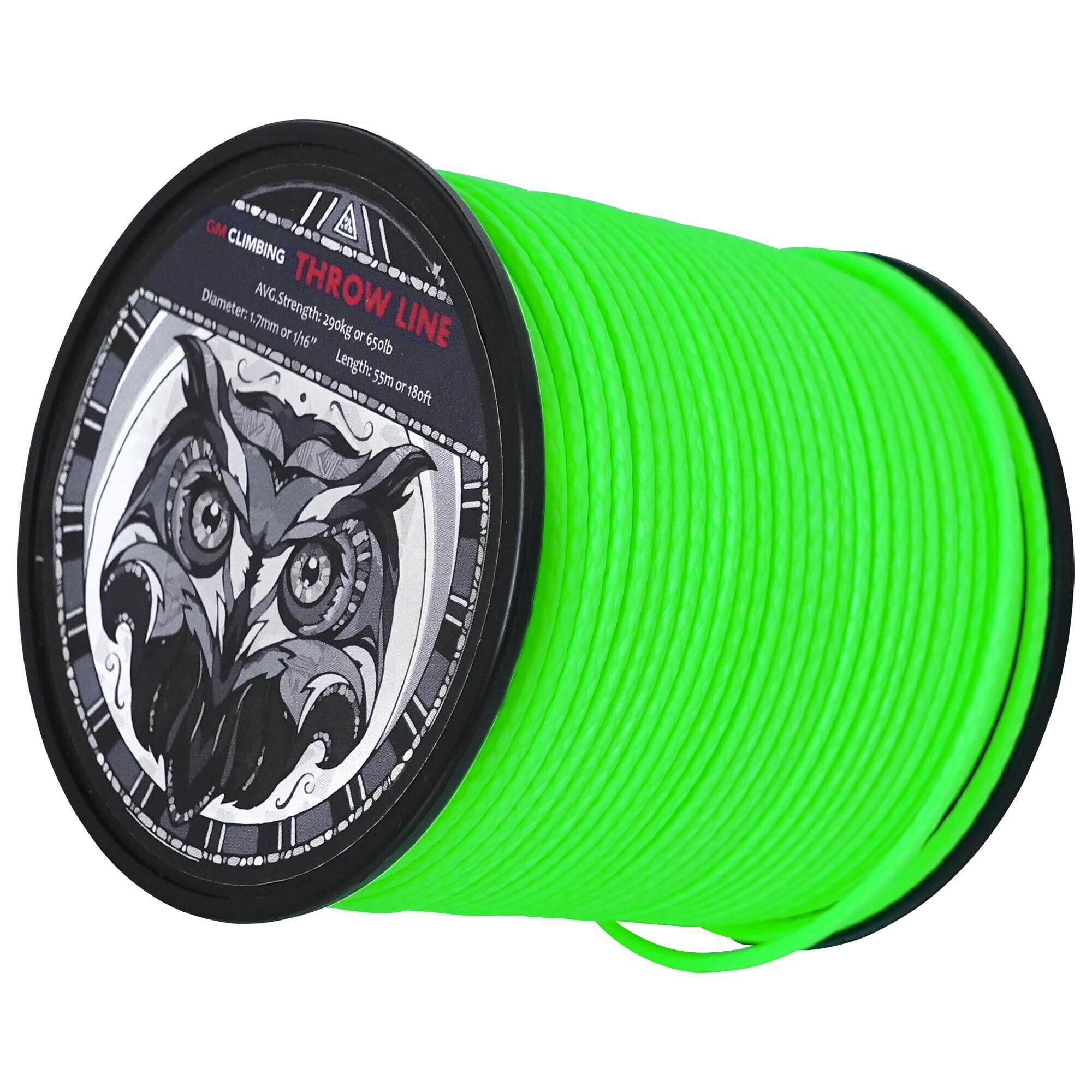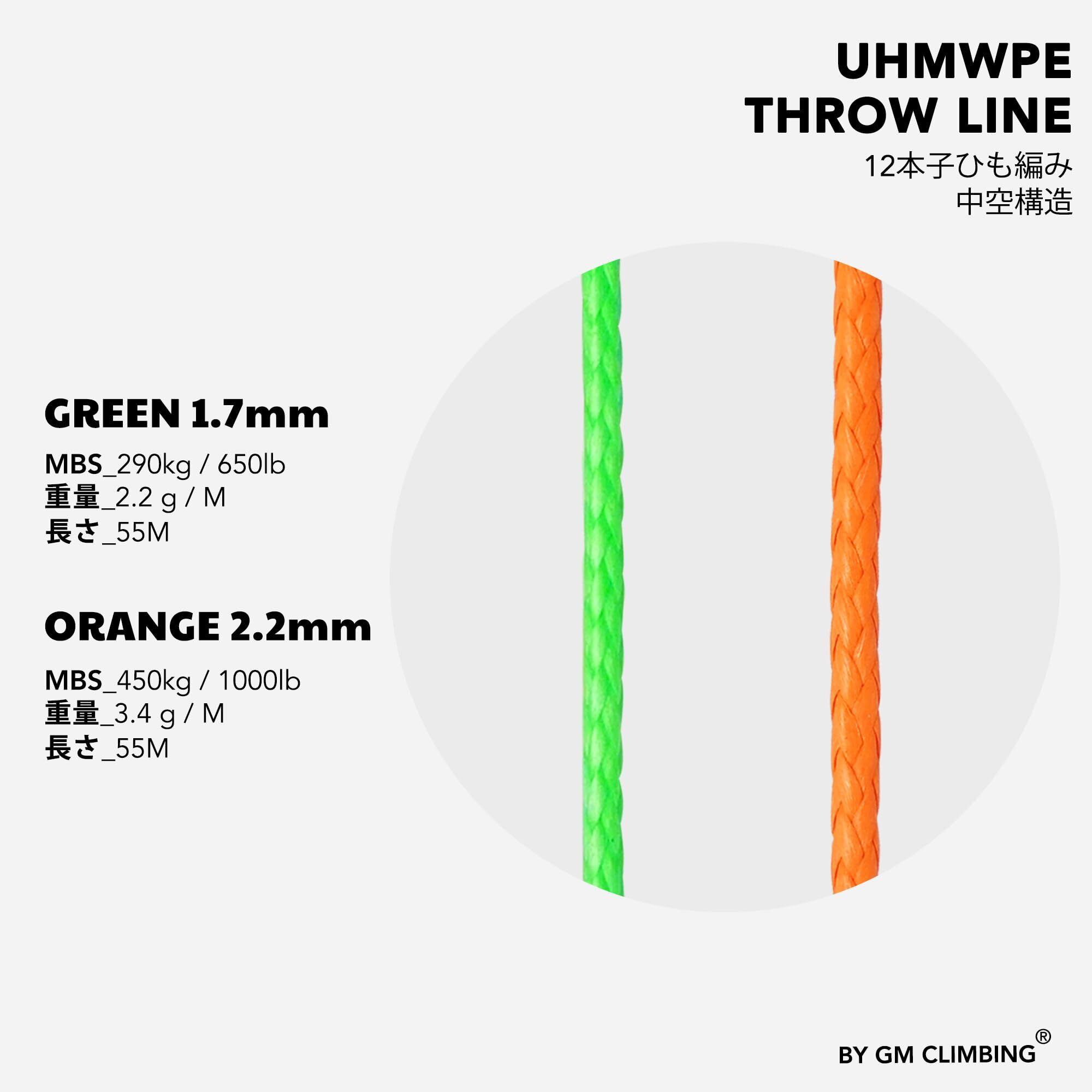 GM CLIMBINGのスローラインは100%超高分子量ポリエチレン繊維により製造され、非常に軽くて高強度に優れます。1.7mmの650lbと2.2mmの1000lbの2サイズを提供し、さまざまな使用に適します。