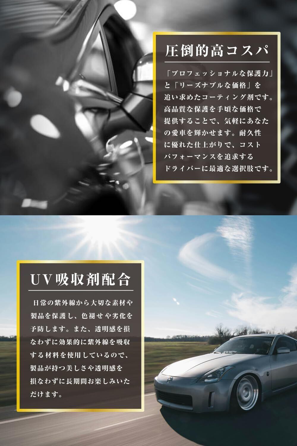【 超耐久性能!6ヶ月間キープ 】 ▶︎高耐水シリコーンレジンを採用し、雨や洗車で落ちにくく、黒く綺麗な状態を6か月間持続することができます。 【 UV吸収剤を配合 】 ▶︎新車に使用することで未塗装樹脂パーツの劣化を防ぐコーティング剤としても使用することができます。
