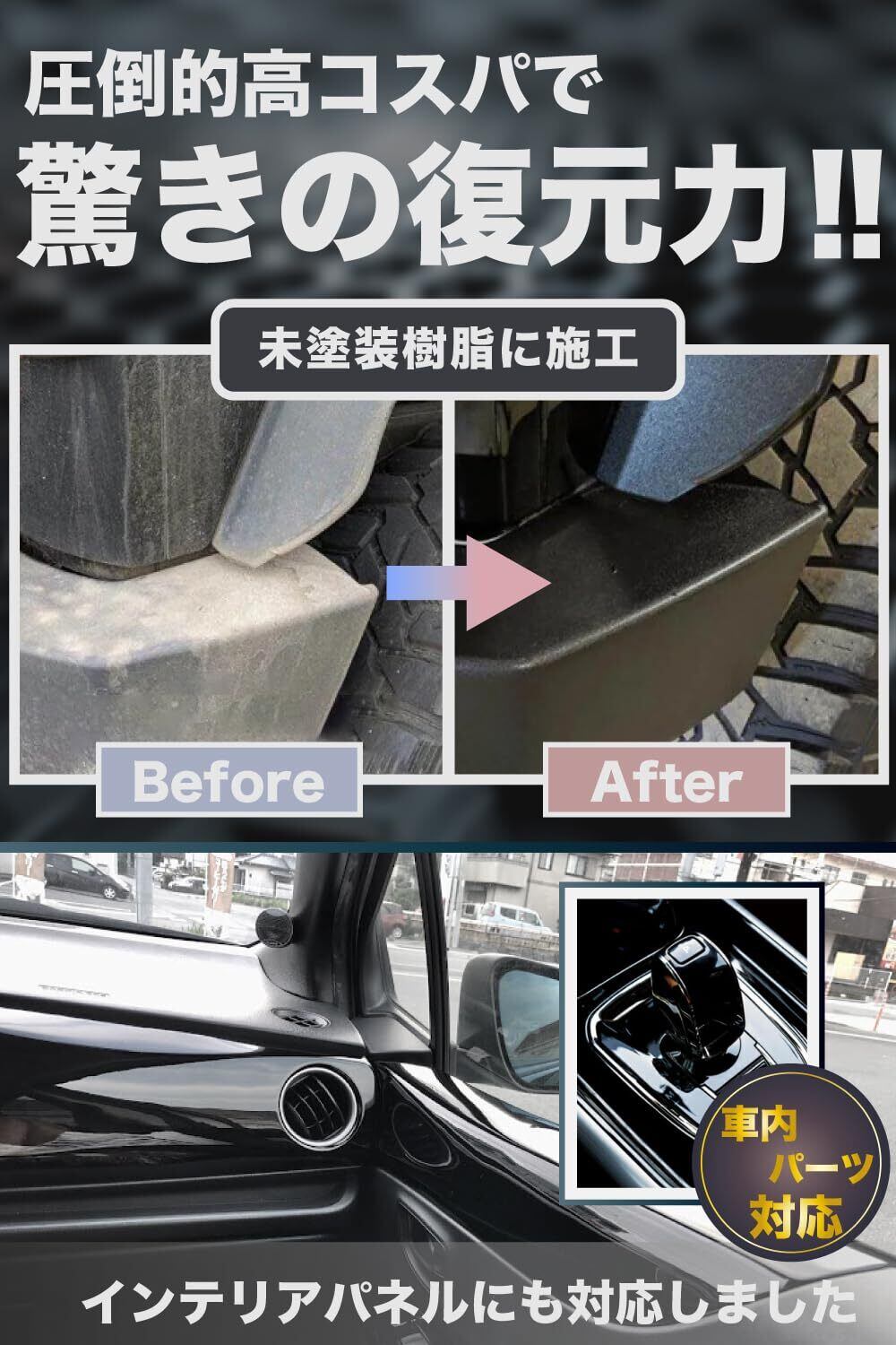【 気になる樹脂パーツが蘇る 】▶︎車→ワイパー付近、ドアパネル足元、グリル、バンパー、内装、ダッシュボード、フェンダーアーチ等。バイク→ミラーカバー、タンク周り、リアフェンダー等。【 内装パーツにも使用可 】 ▶︎バンパーやゴムパーツだけでなく、車内のエンジンルーム、インテリアパネルにも使用できます。