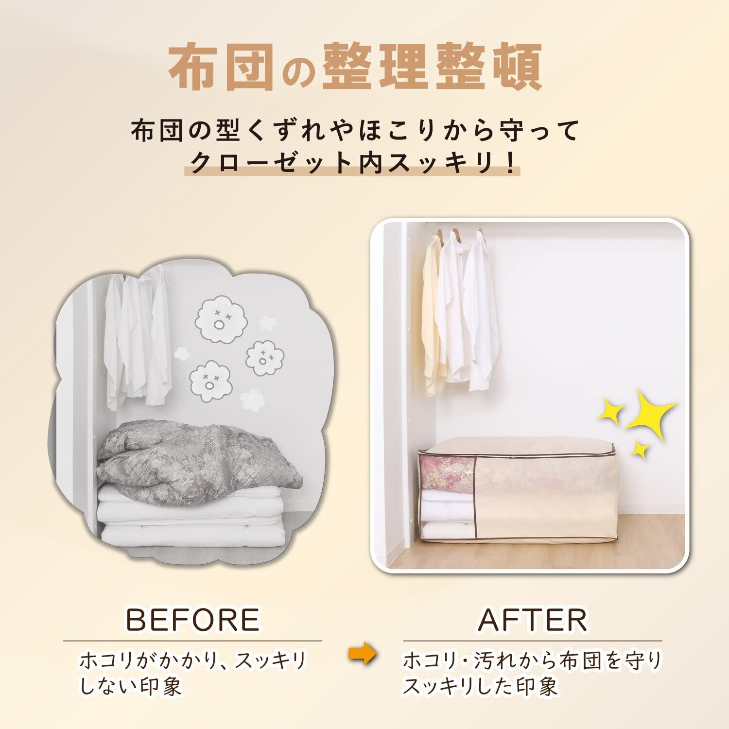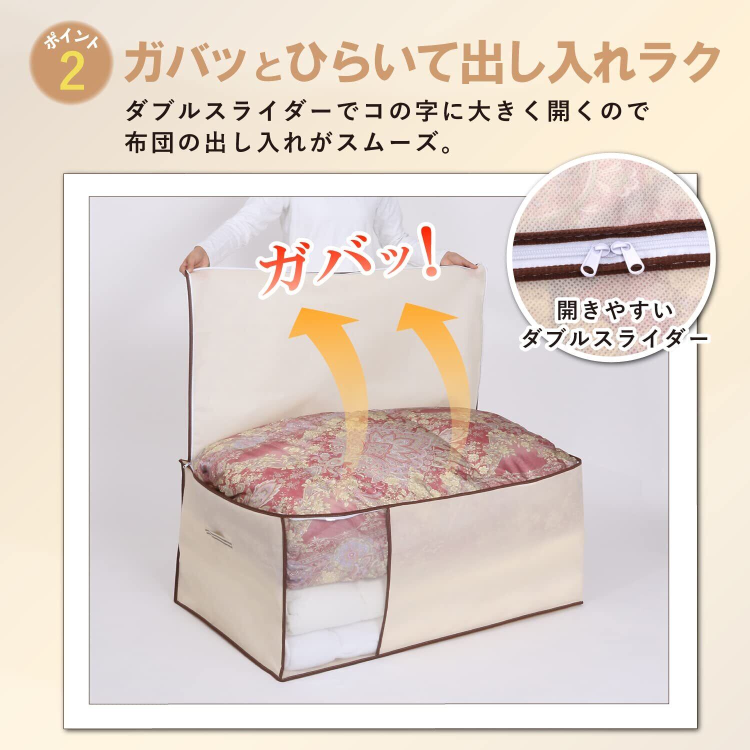 【通気性の良い不織布製の布団収納袋】:通気性の良い不織布で来客用などの布団一式をホコリから守り保管。