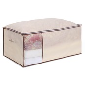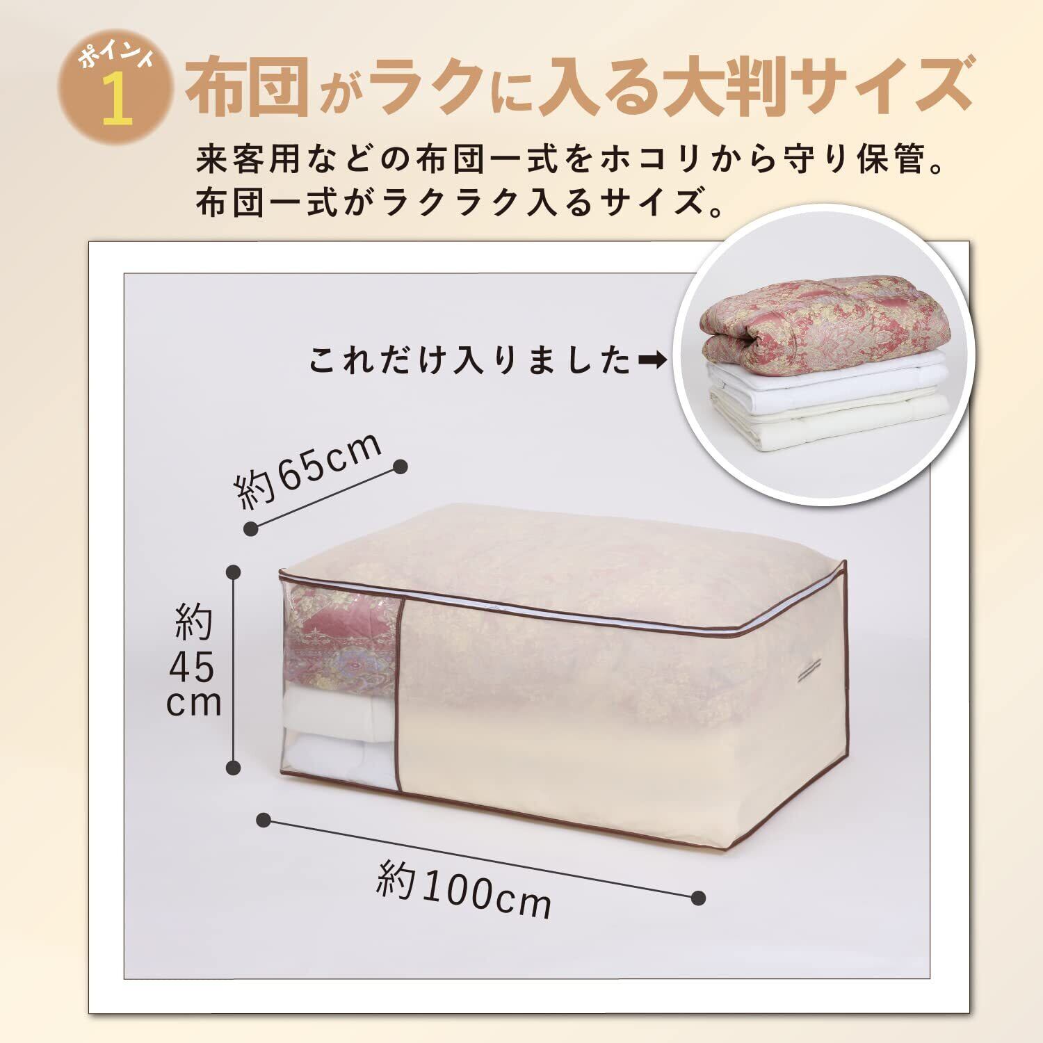 【商品仕様】:サイズ/約幅100×奥行65×高さ45cm、カラー/ベージュ、内容/1枚、収納目安/シングルサイズの敷き布団なら約2~4枚・またはシングルサイズの布団一式(掛け・敷き布団各1枚)、材質/ポリプロピレン